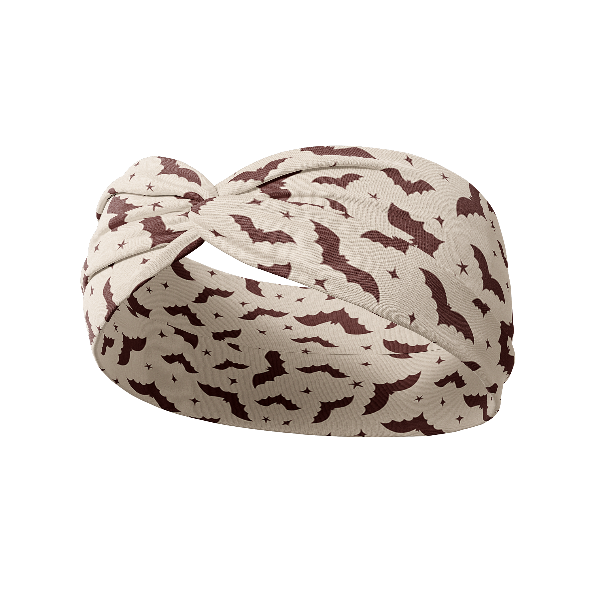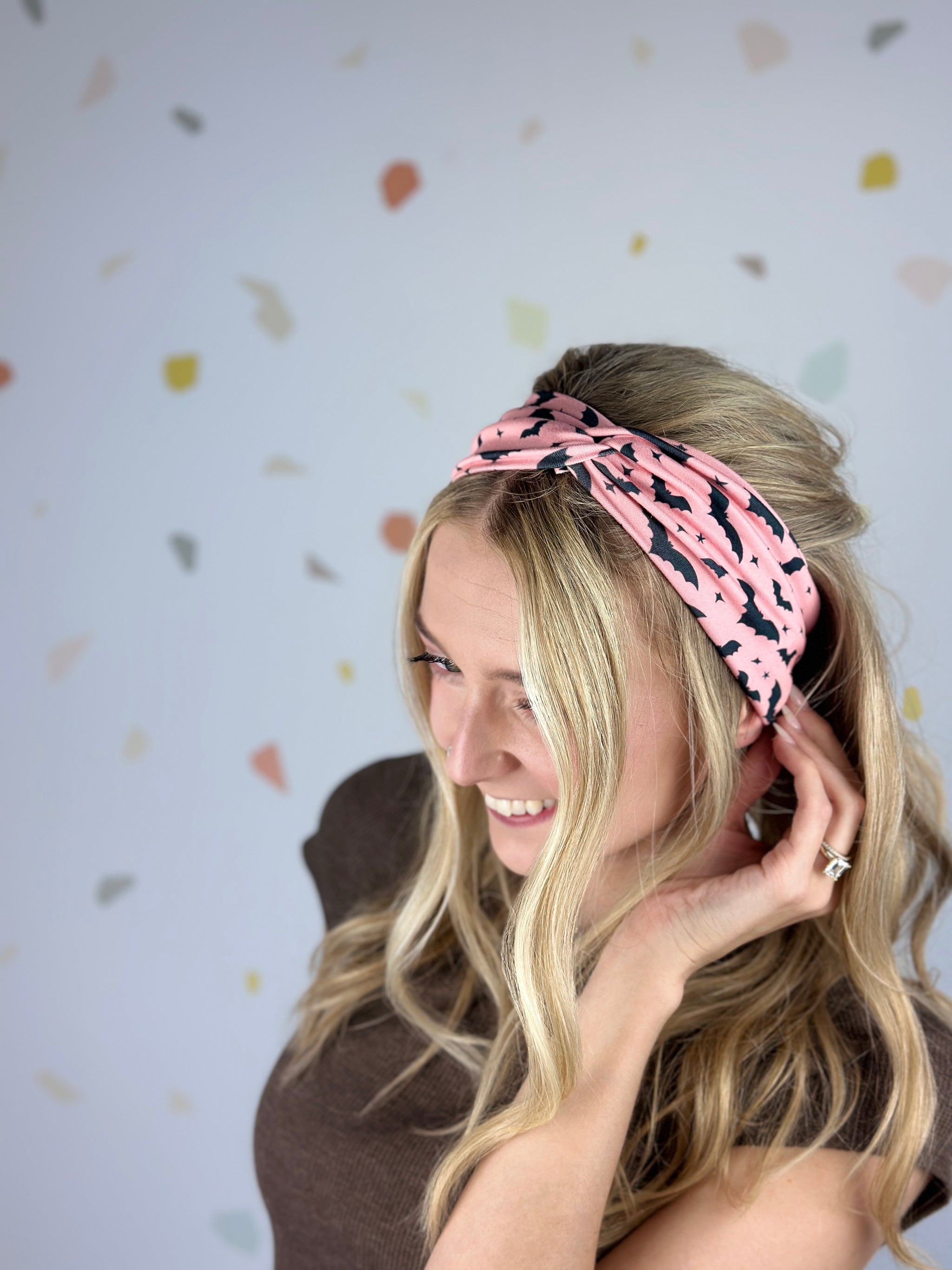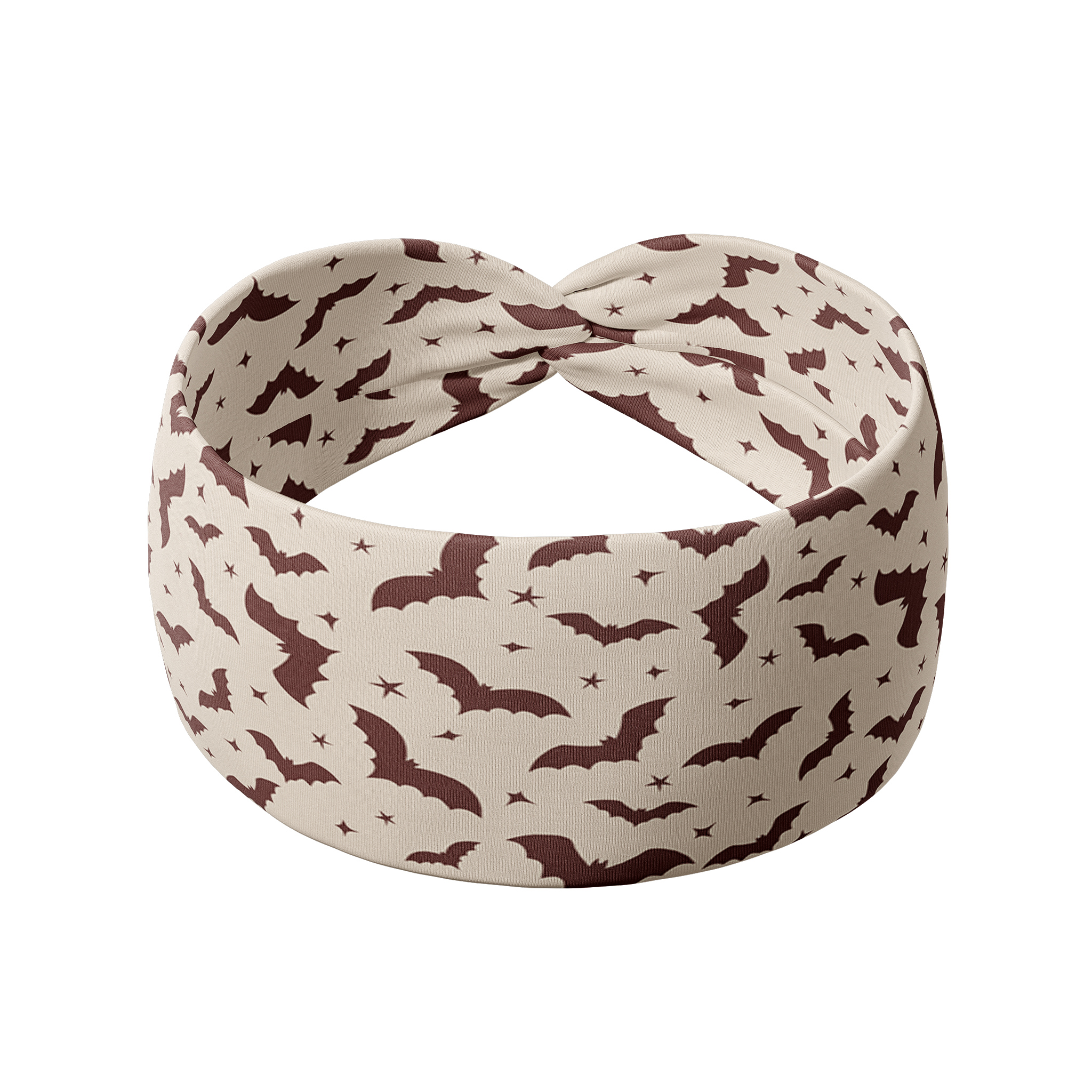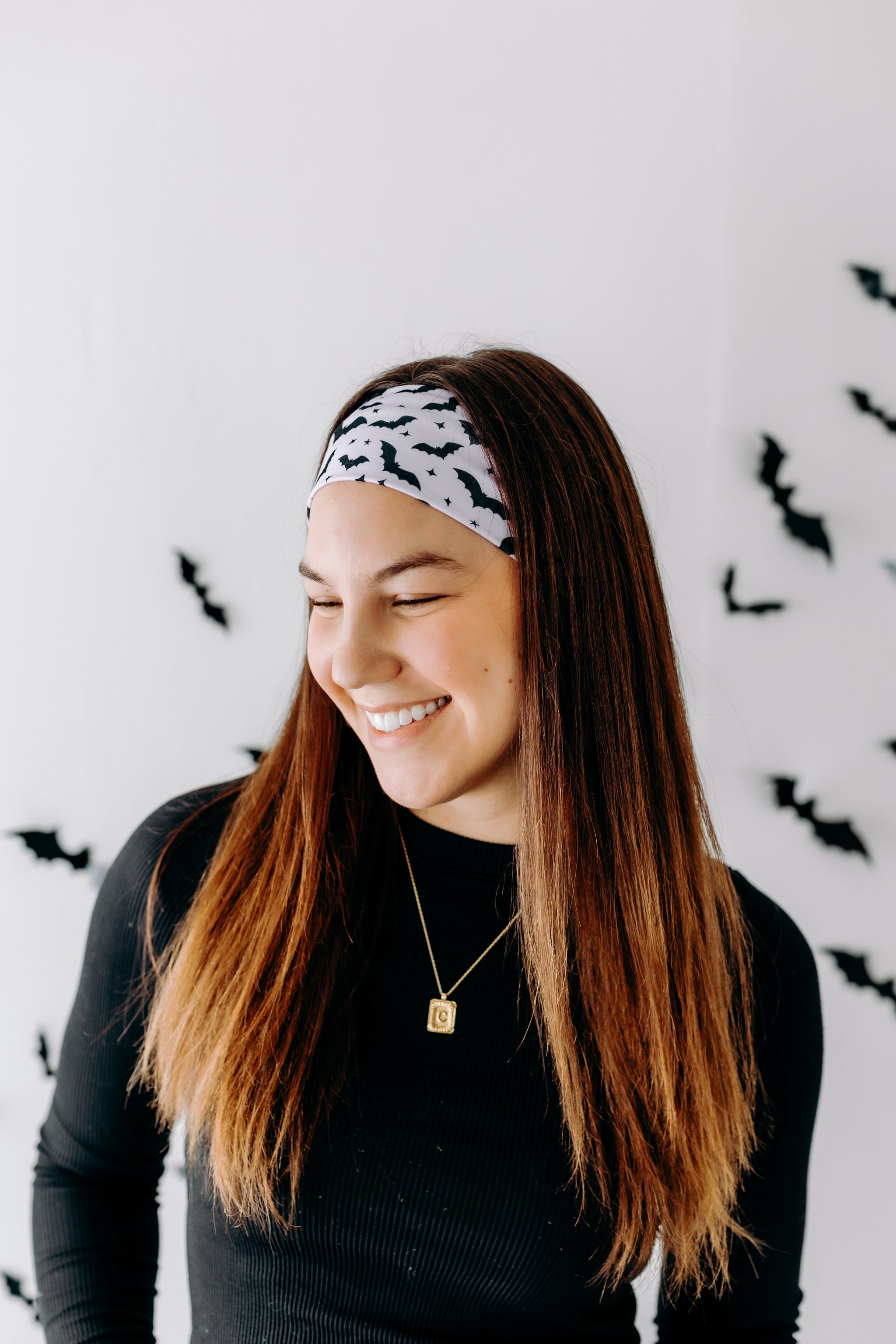 Purple headband with black bat print, titled It's Frickin' Bats, I Love Halloween. Versatile, non-slip, and machine washable, perfect for workouts or daily wear.