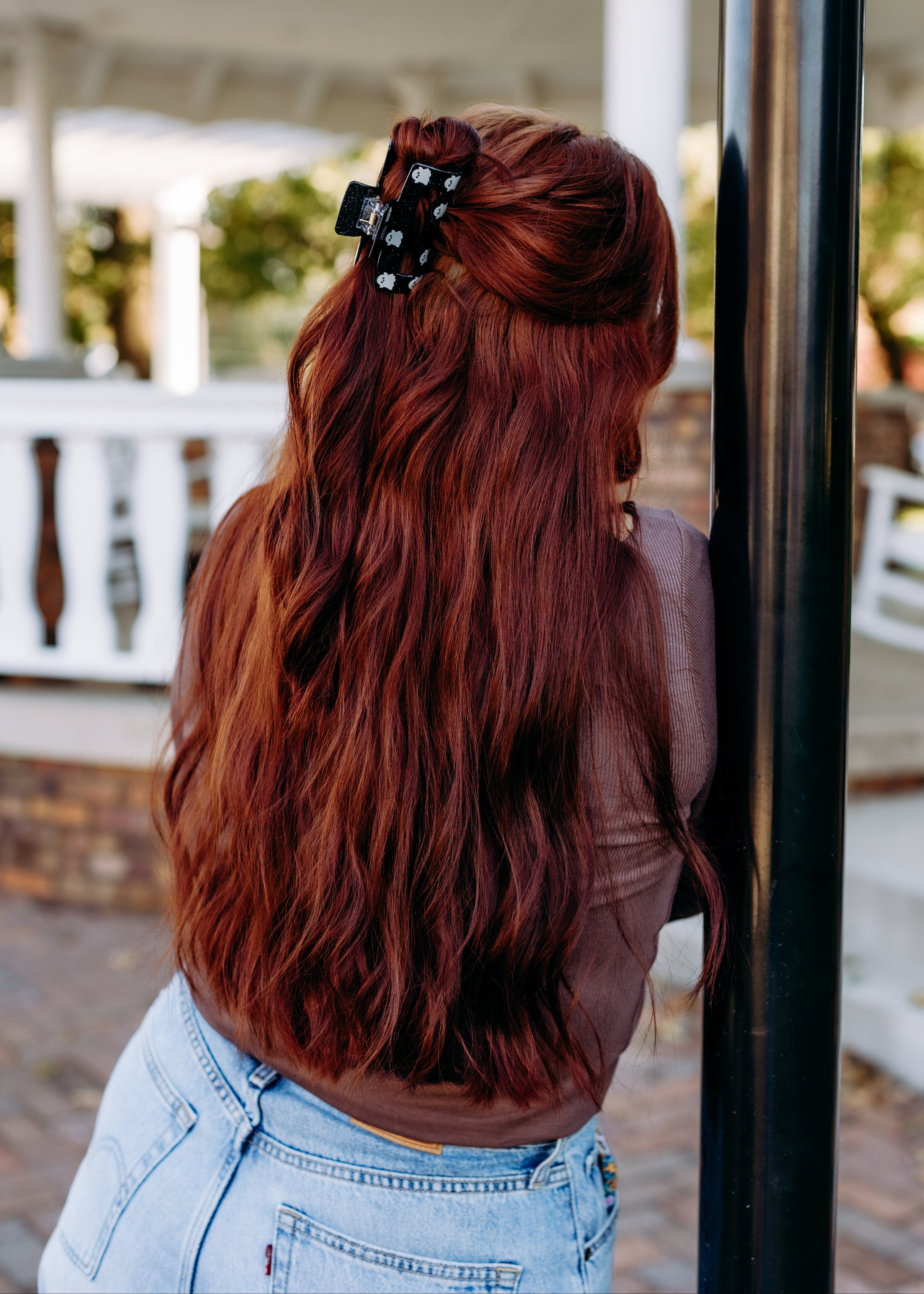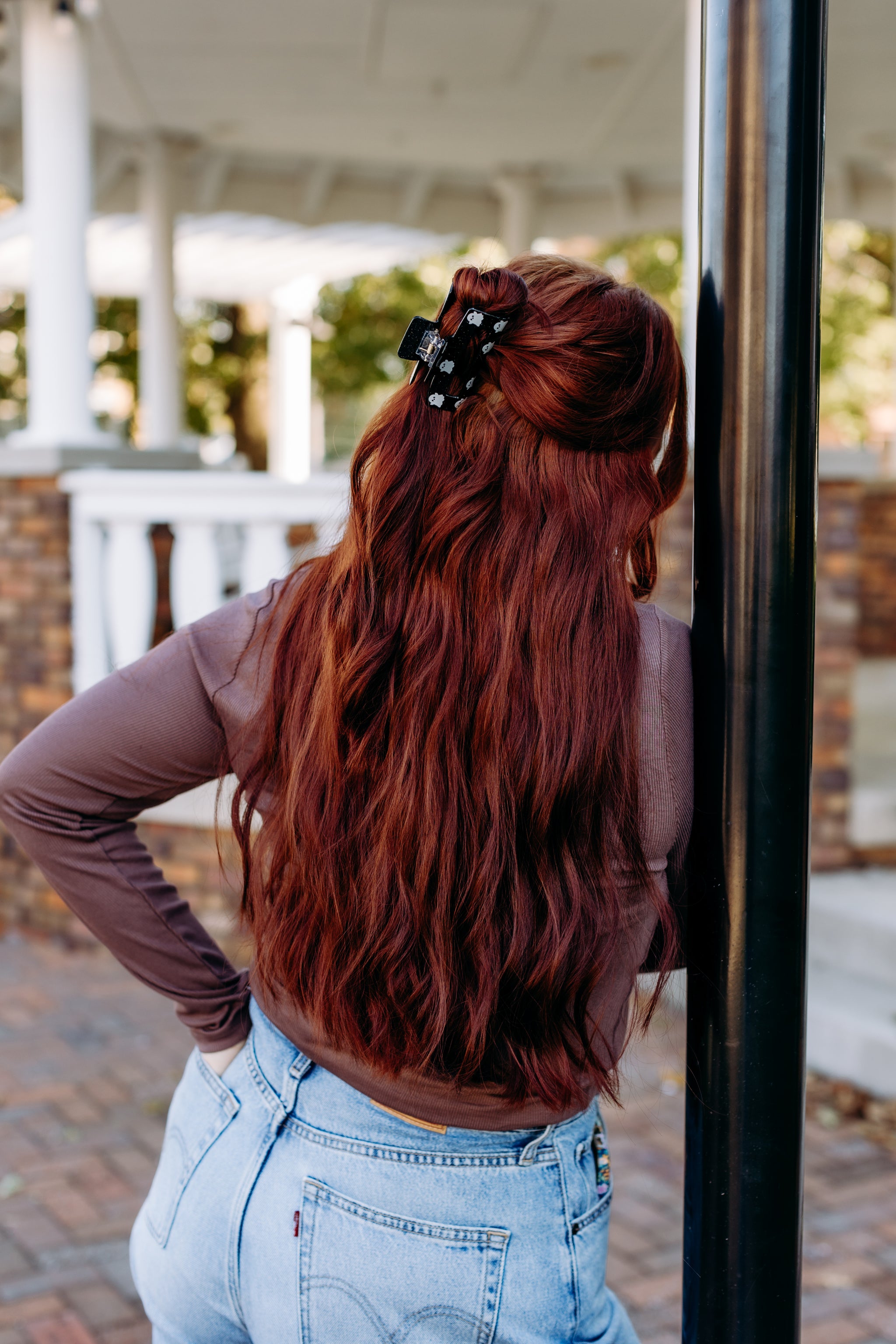 A woman with long hair styled perfectly with the On Cloud 9 Lilac Clip, showing both fashion and functionality.