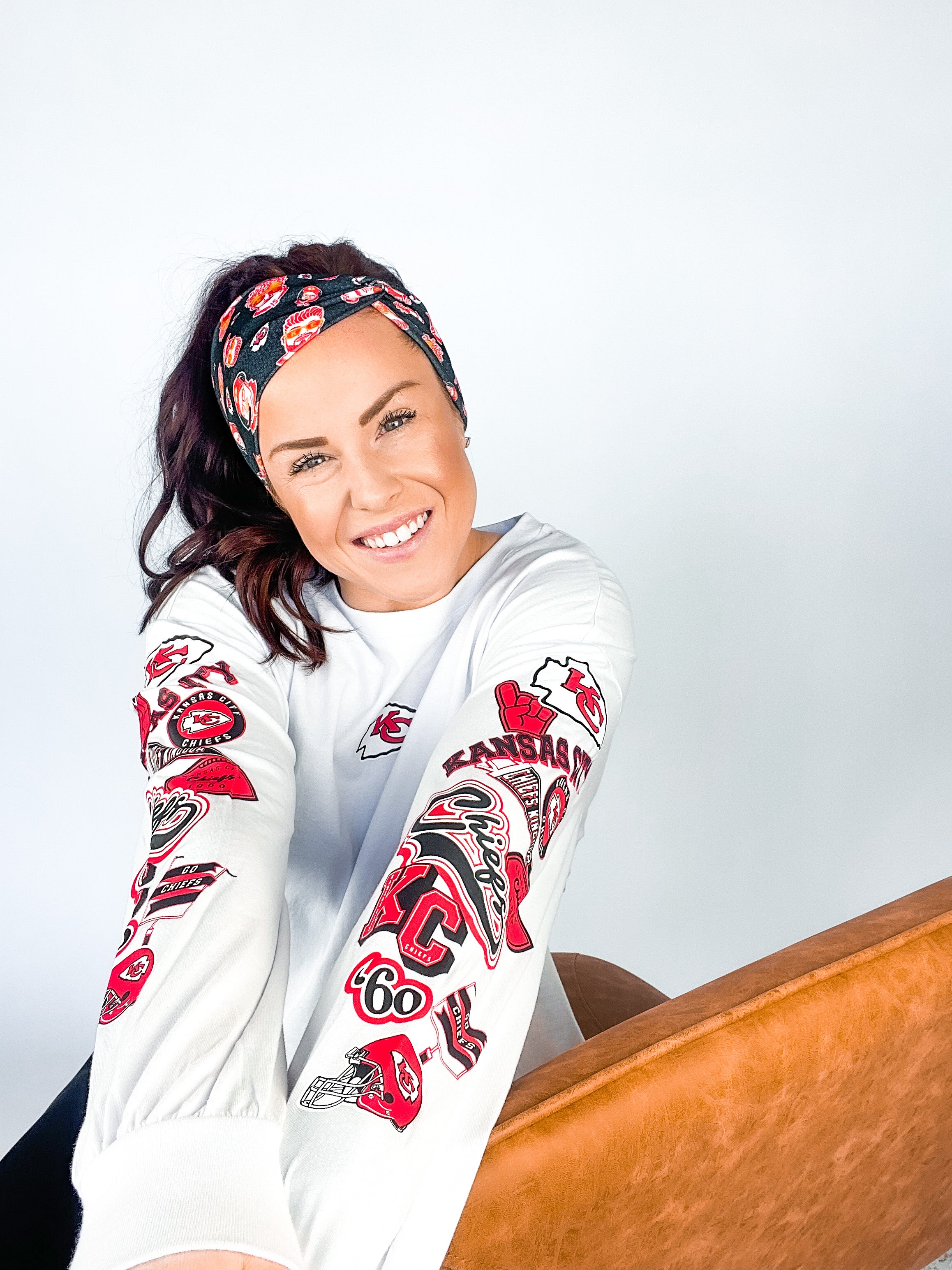 Adult women's black headband with yellow, red and white artistic cartoons of Patrick Mahomes, Avery Reid and Travis Kelce