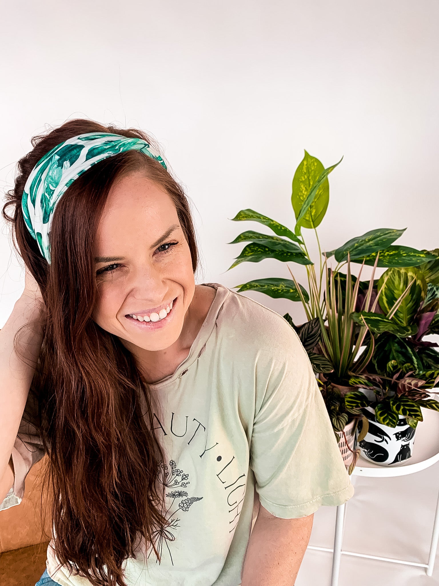 Adult women's white headband with large green leaf houseplant print
