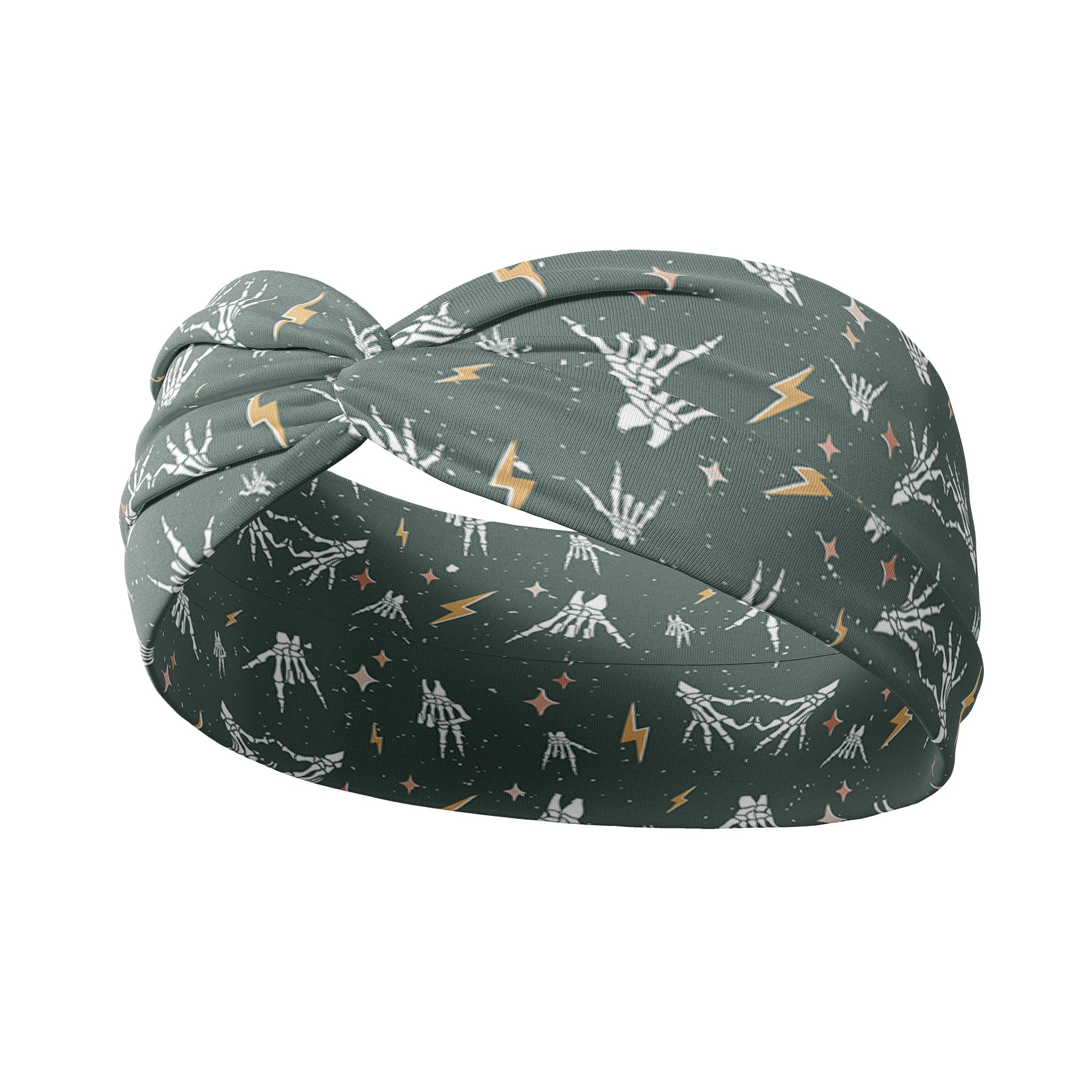 Adult women's emerald green headband with skeleton hands signing love, peace, rock-on and hang-loose shaka sign with yellow lightneing bolts and orange and pink diamonds