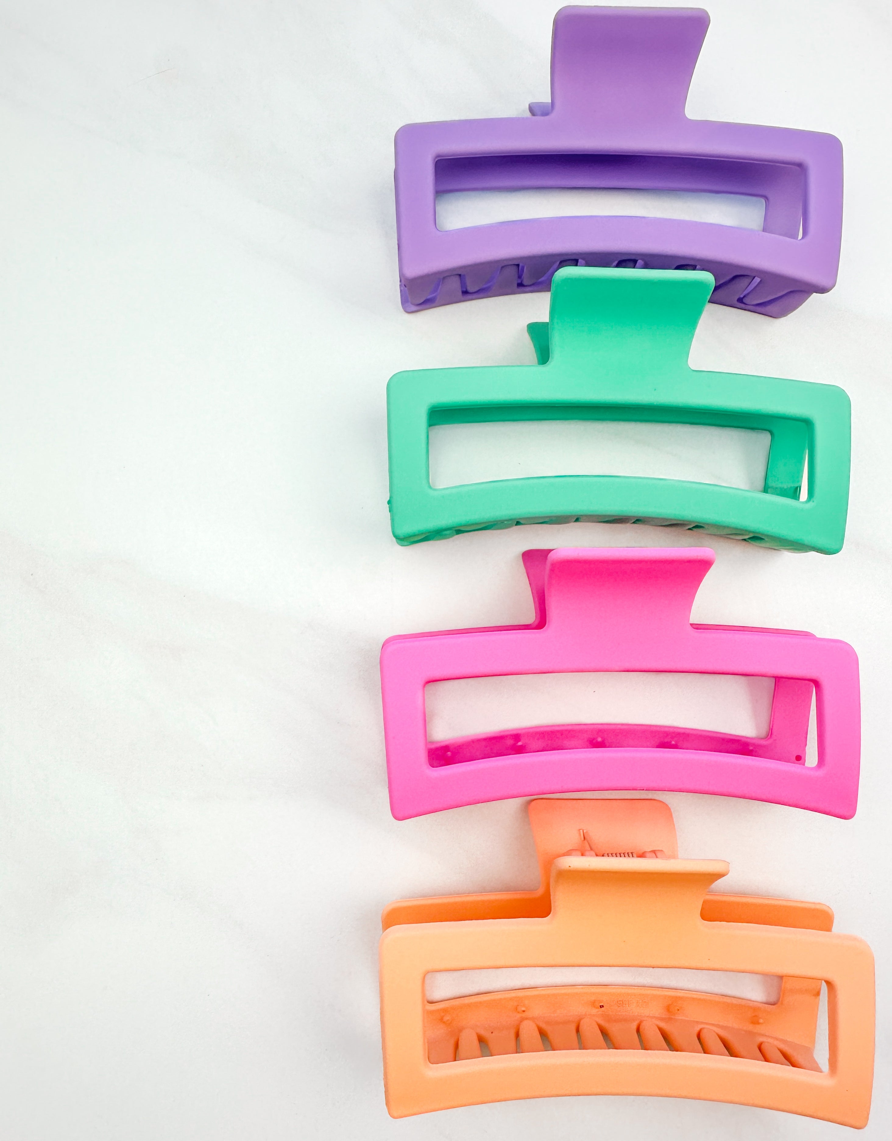 A group of various colors of Vacation Vibes Lilac Clips, 4.8 inches long, matte material, with a hinge closure. Perfect for all hair types, keeping hair out of your face.