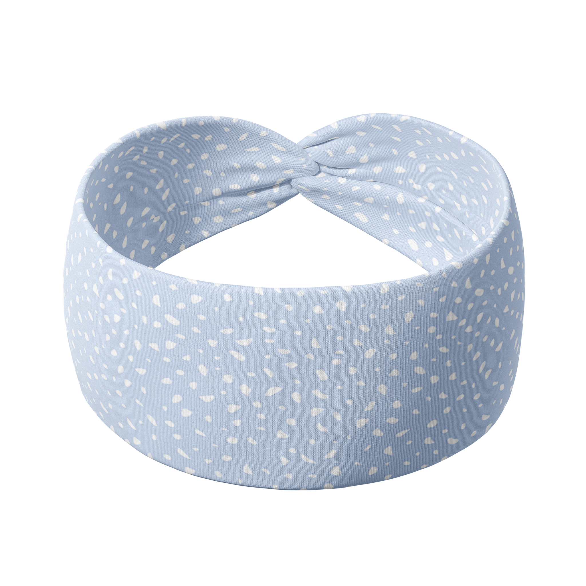 A versatile light beige Chai Latte headband with white natural spots, designed for confidence and function. Features ultra-stretchy poly-knit blend, sweat-absorbent double-layer fabric, and a 3-in-1 twist style. Made in Springfield, MO.