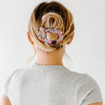 Woman wearing the Grow With Grace Clip from The Sarah Wallace collection, a 4.4-inch metal hair accessory with a flower design, securing her hair in a bun.