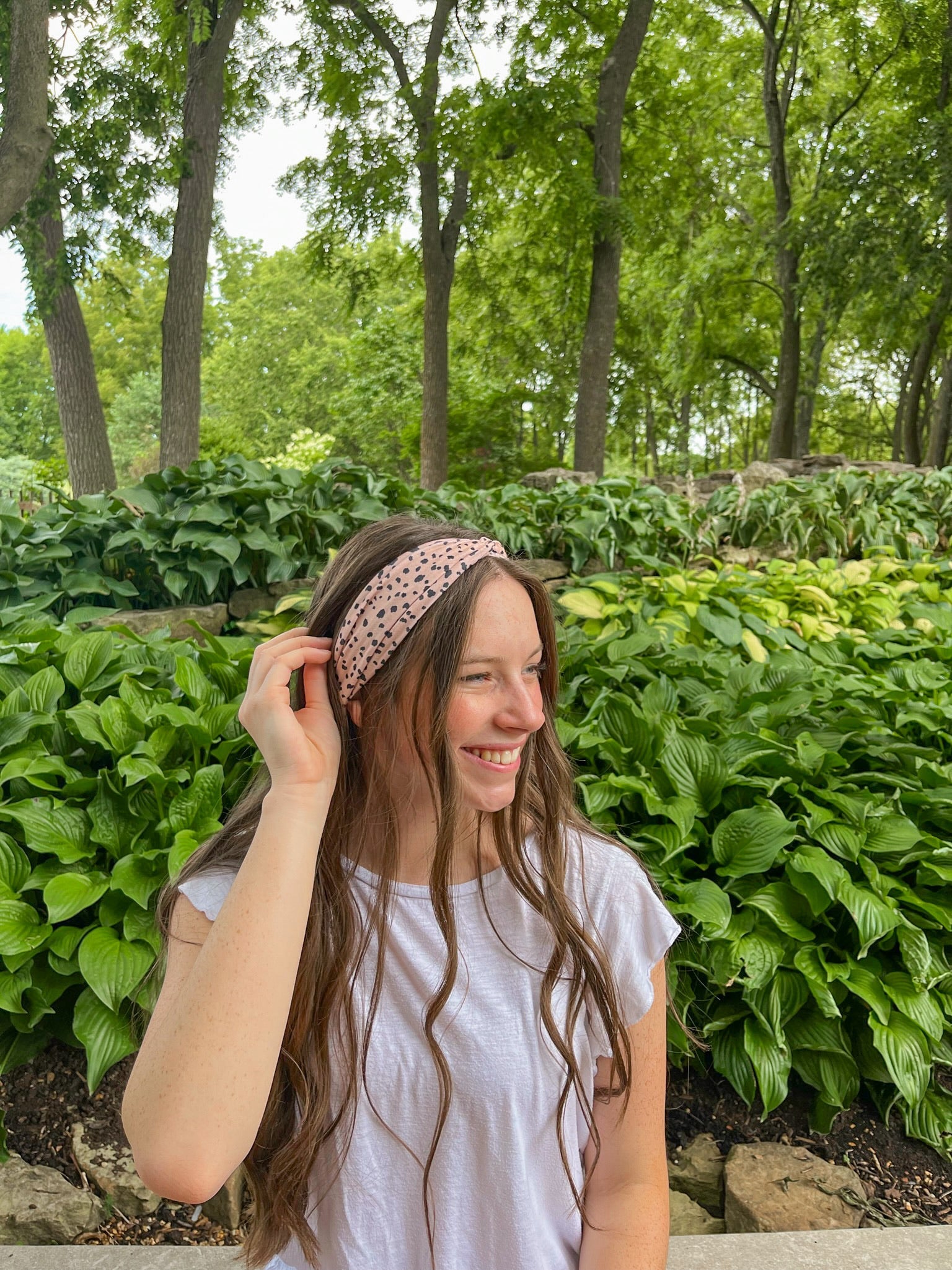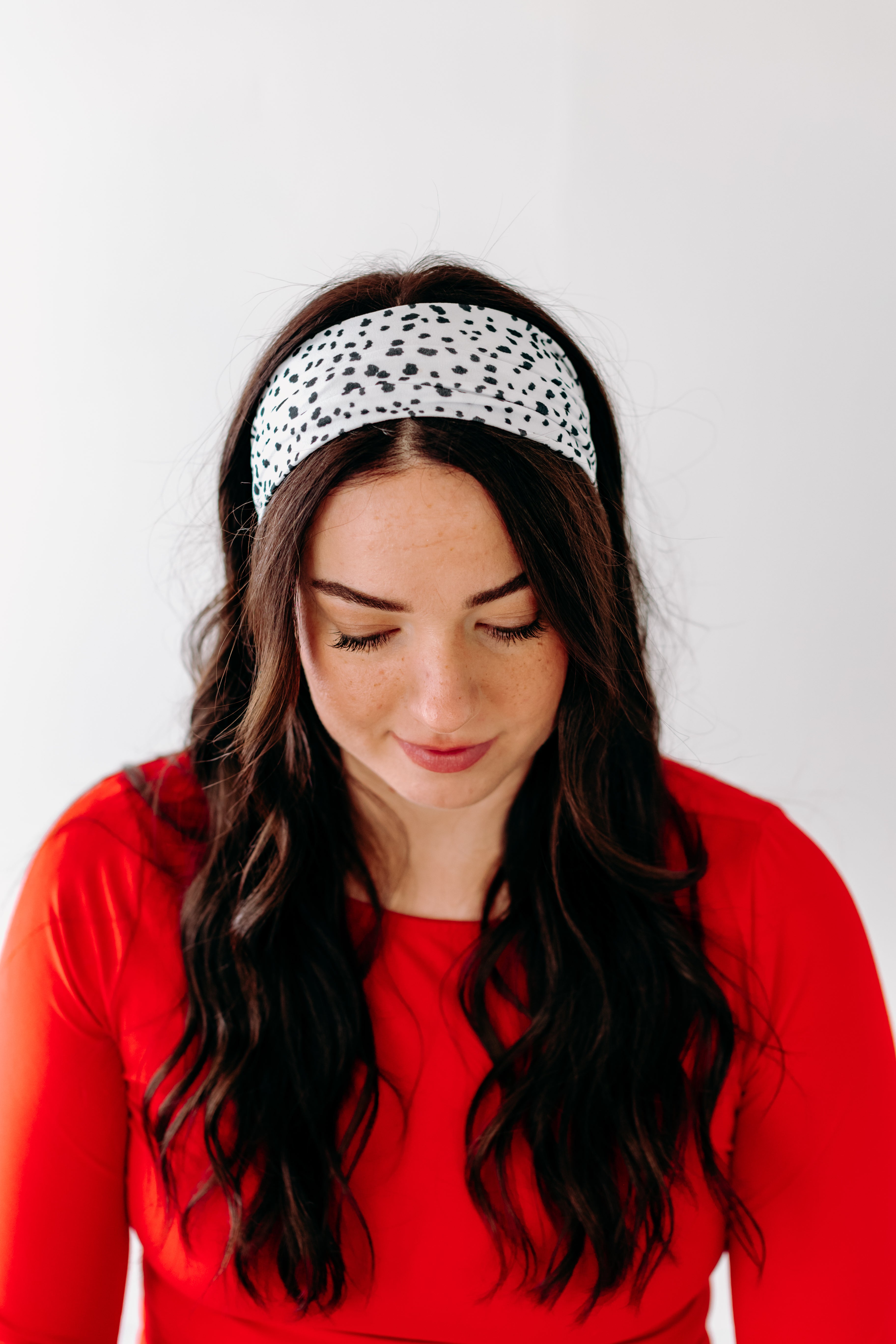 Adult women's white headband with small black Dalmatian spots