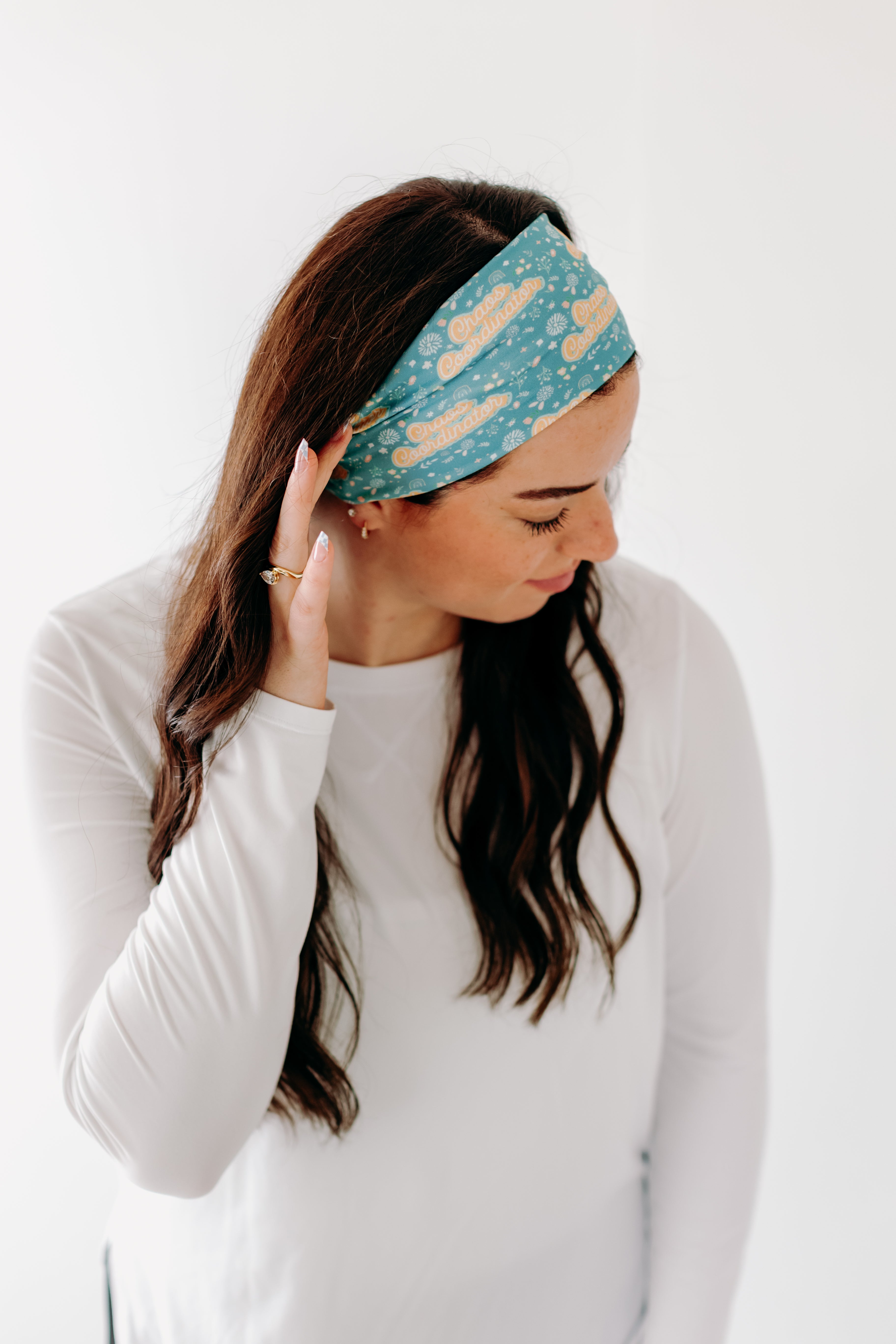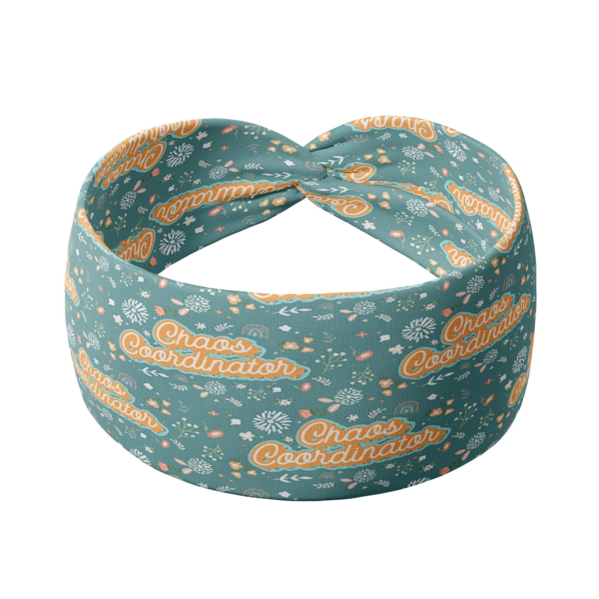 Adult women's blue headband with allover yellow and white confetti print with "chaos coordinator" cursive script