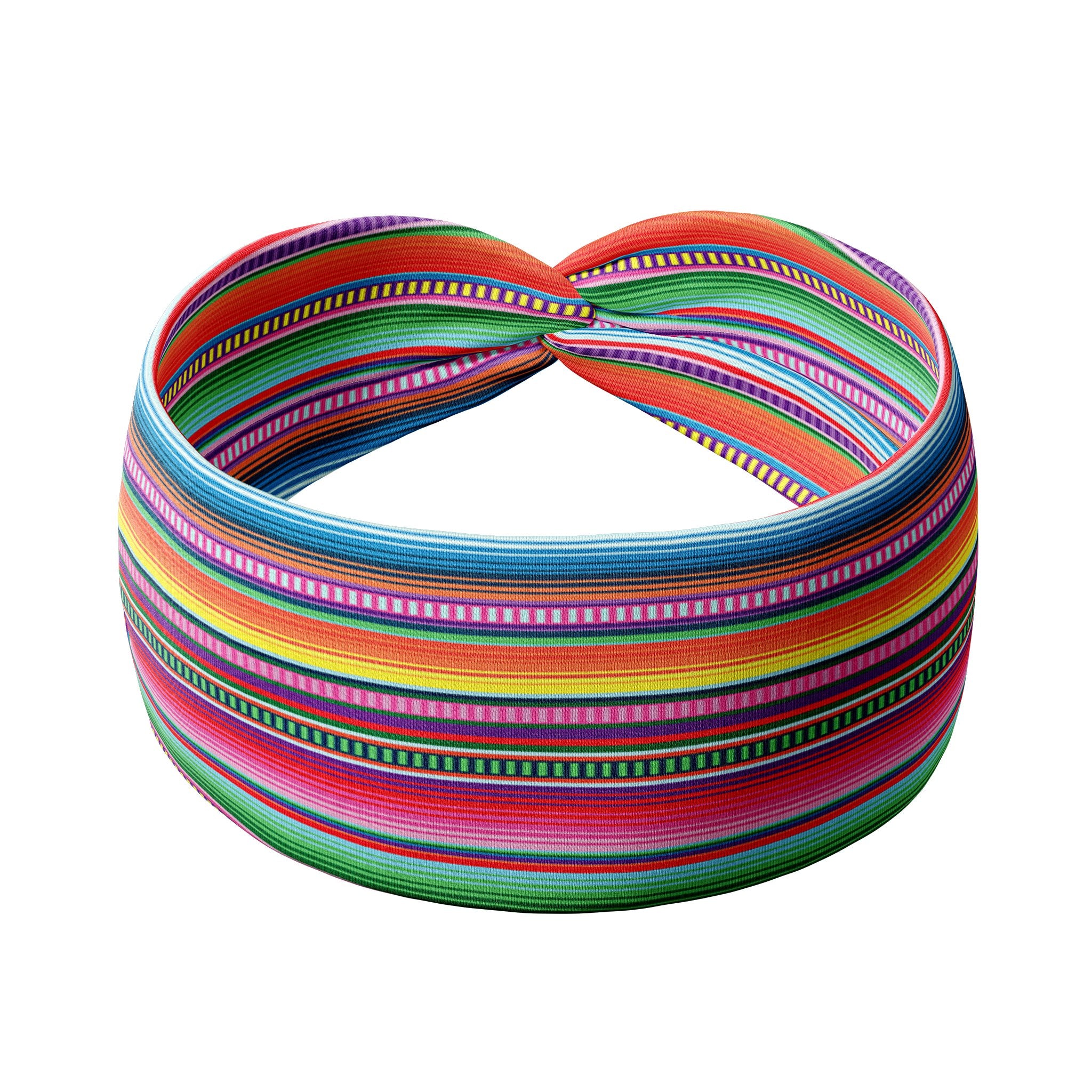 Adult women's headband with orange, purple, yellow, blue, green and red stripes and dots
