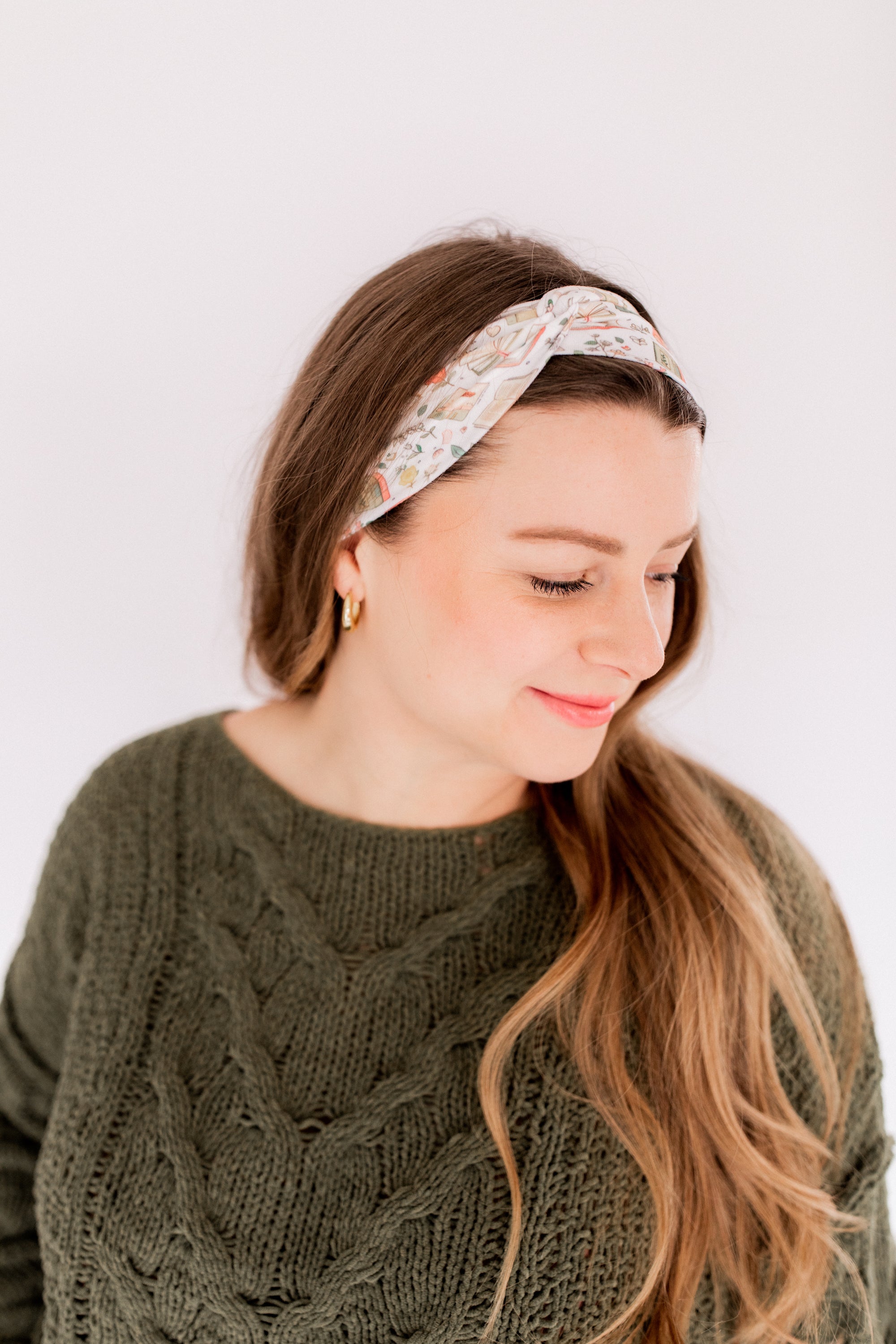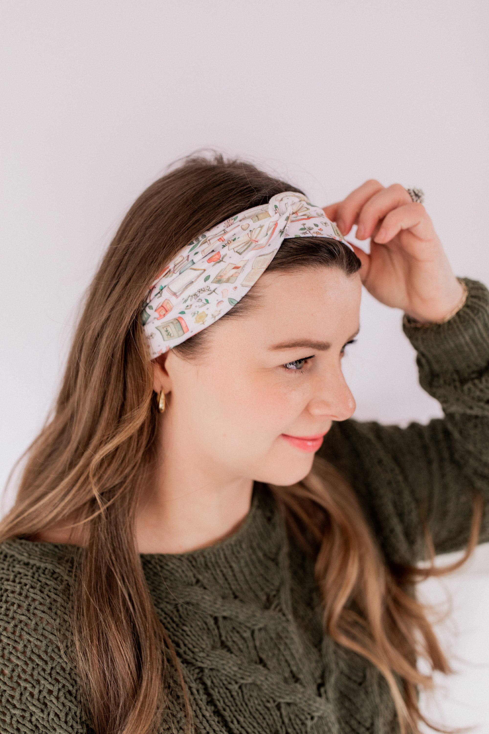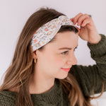 A white Petals and Pages headband featuring a book and floral print, designed for confidence and functionality. Lilac Market's Book Fairy headband offers a versatile 3-in-1 twist style, sweat-absorbent fabric, and a non-slip fit. Made in Springfield, MO.