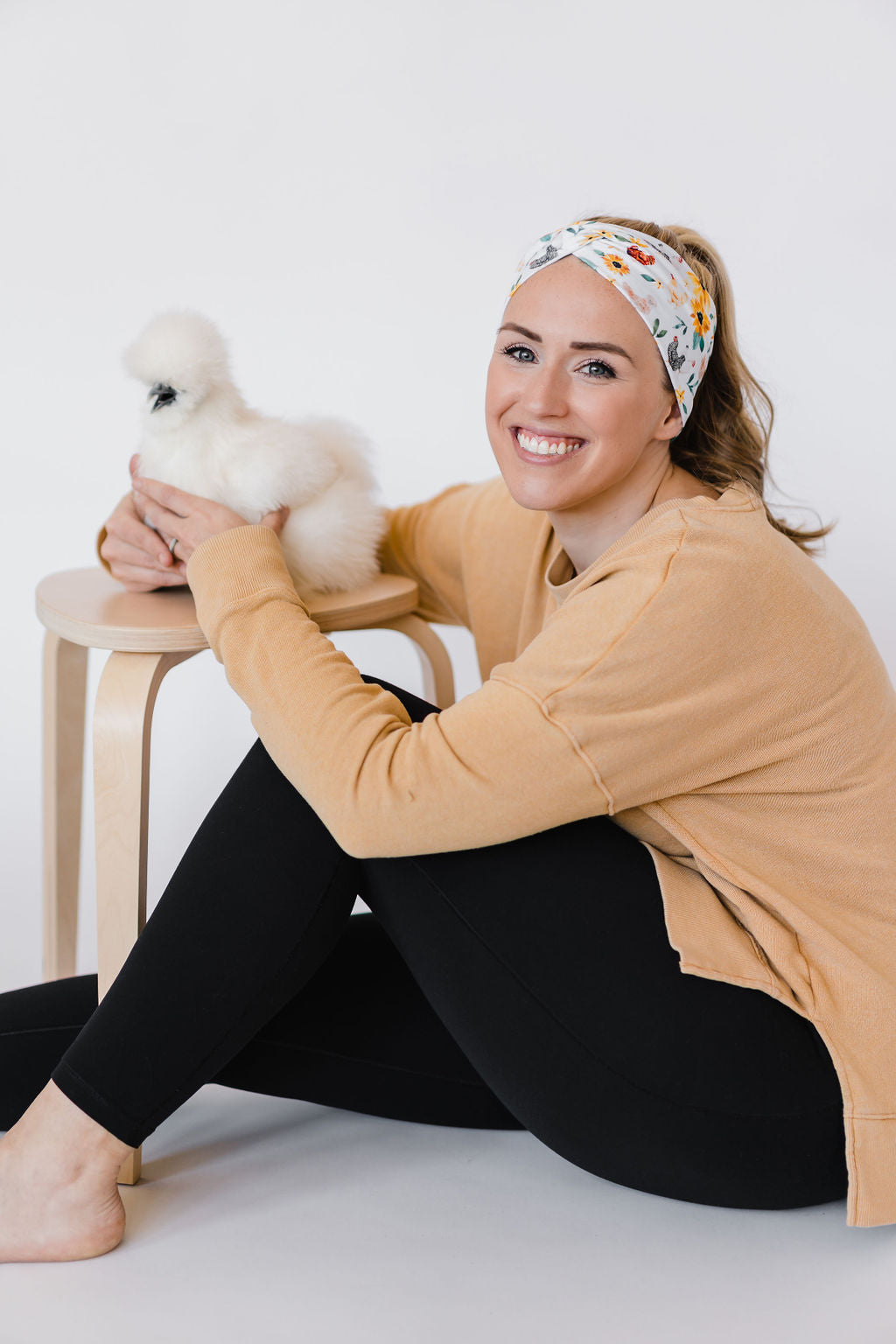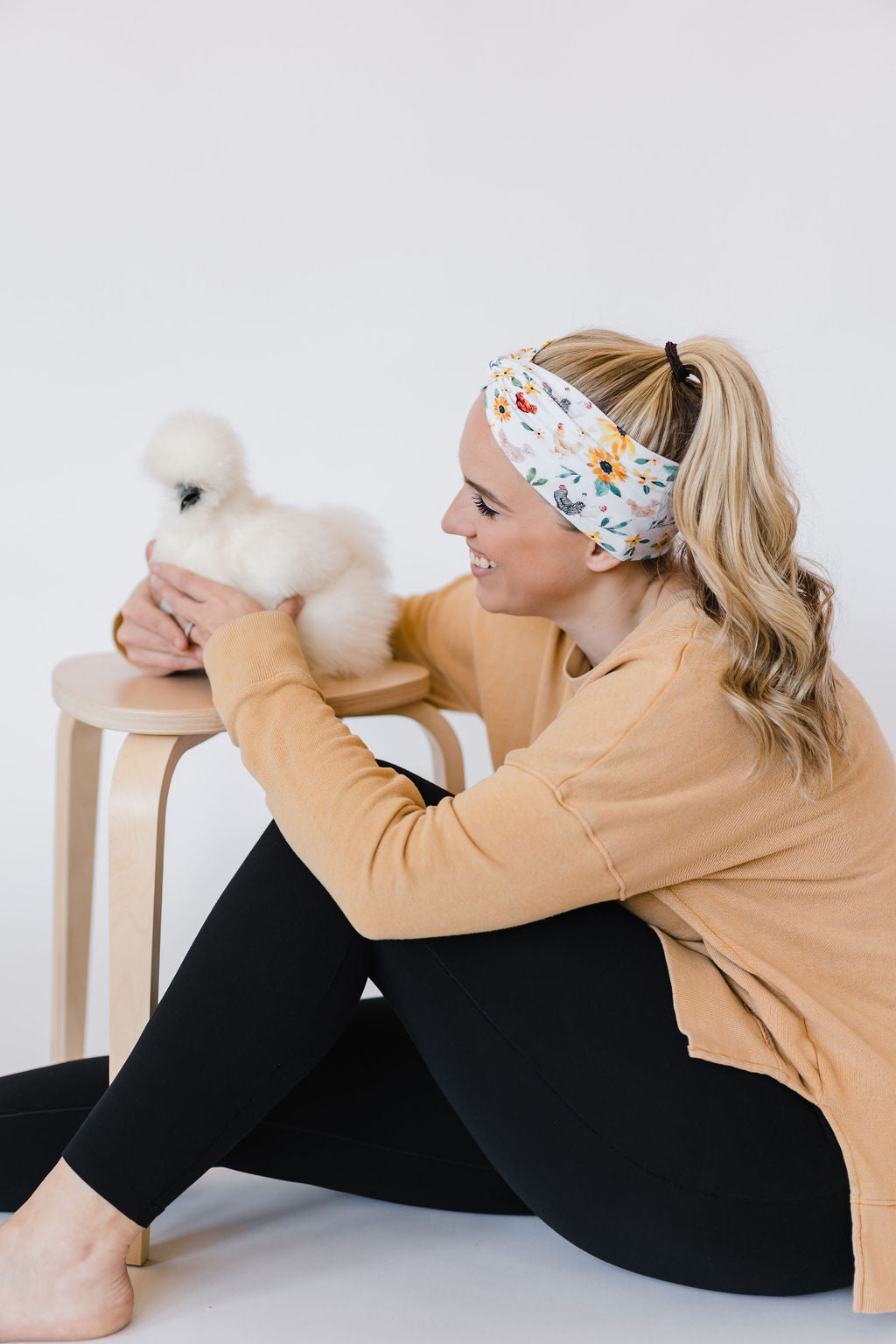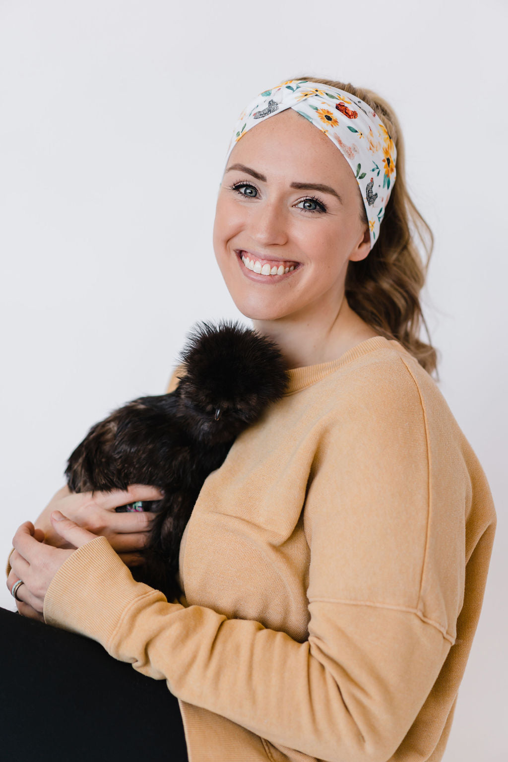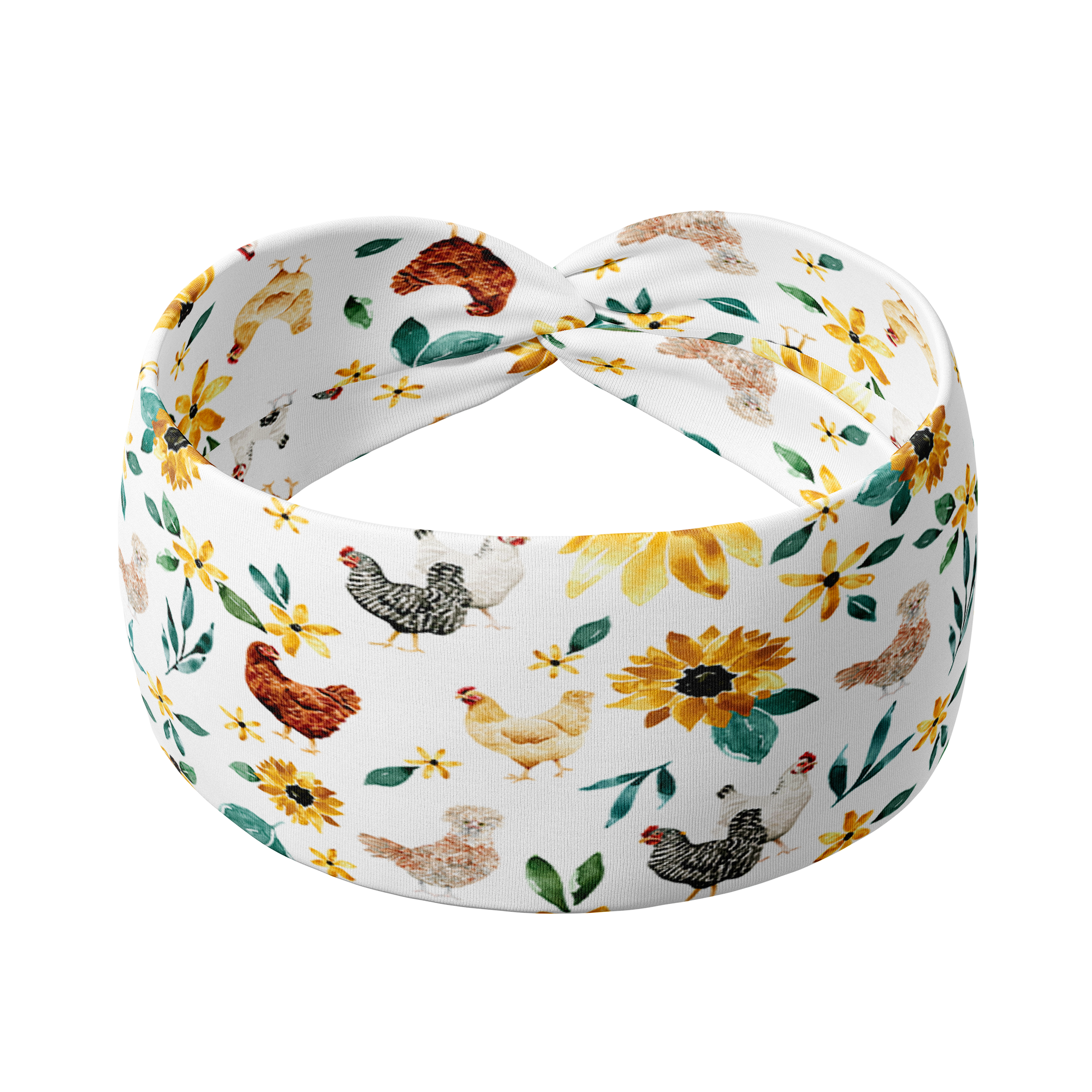 Adult women's white headband with yellow sunflowers with leaves and different breeds of chickens with brown, black, white, and multi-colored feathers