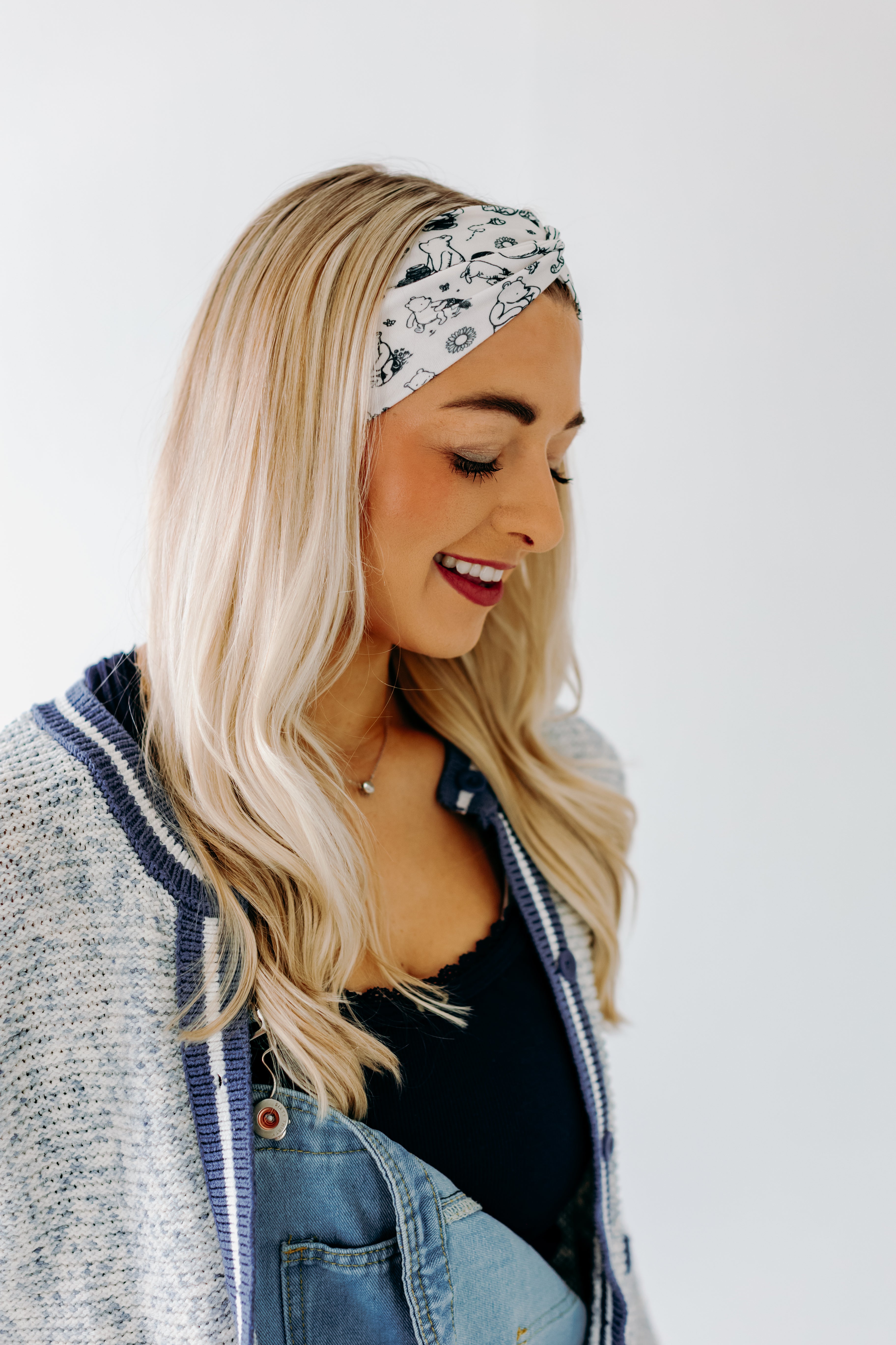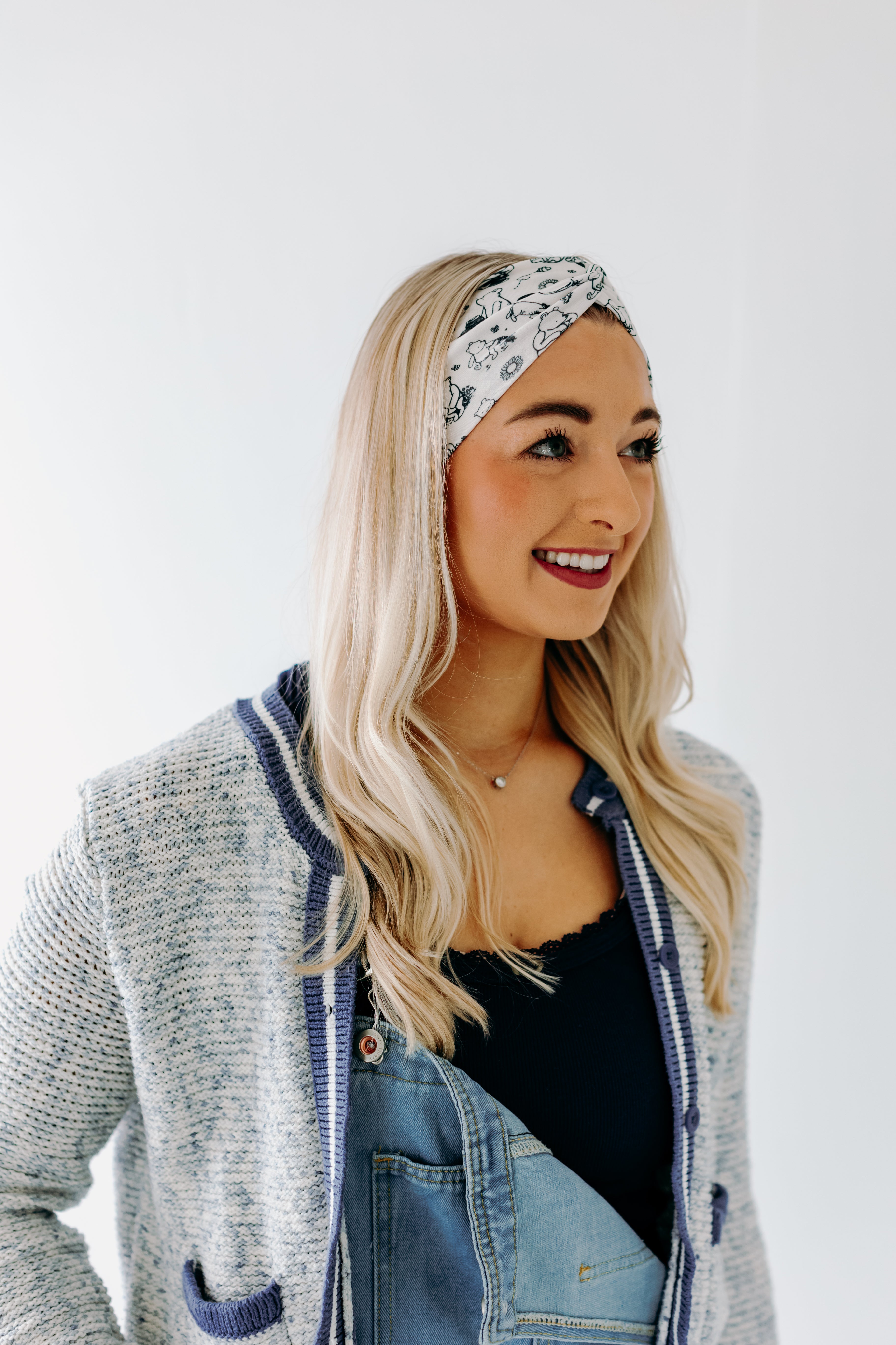 White Little Black Rain Cloud headband with black pen-drawn Winnie the Pooh characters; buttery-soft, ultra-stretchy, double-layer poly-knit, versatile 3-in-1 twist style.