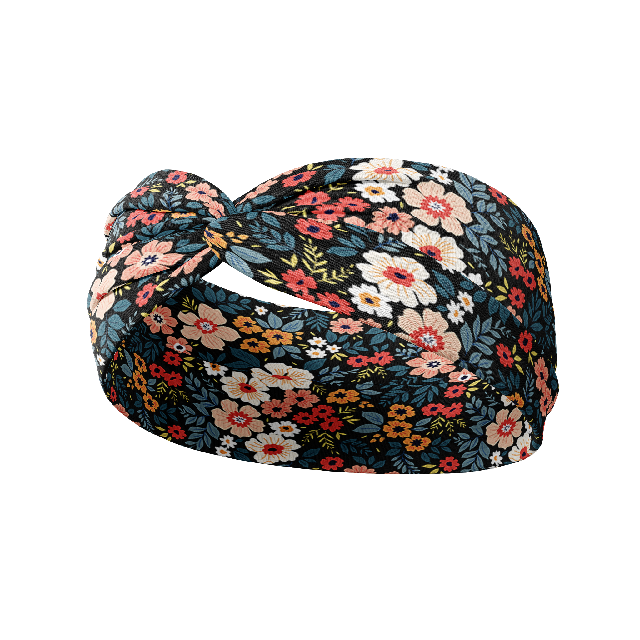 Keely Floral on Black headband, featuring a red, pink, white, blue and green floral pattern, crafted from soft poly-knit blend for versatile wear and non-slip performance.