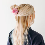 Woman wearing the Grow With Grace Clip from The Sarah Wallace collection, a 4.4-inch metal hair accessory with a flower design, securing her hair in a bun.