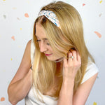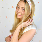 Our headbands can be worn multiple ways! You can place the knot in the middle, to the side, or around to the back so the widest part of the headband is visible. You can wear the headband in front of your hairline, or with some hair pieces framing your face. The style possibilities are endless.