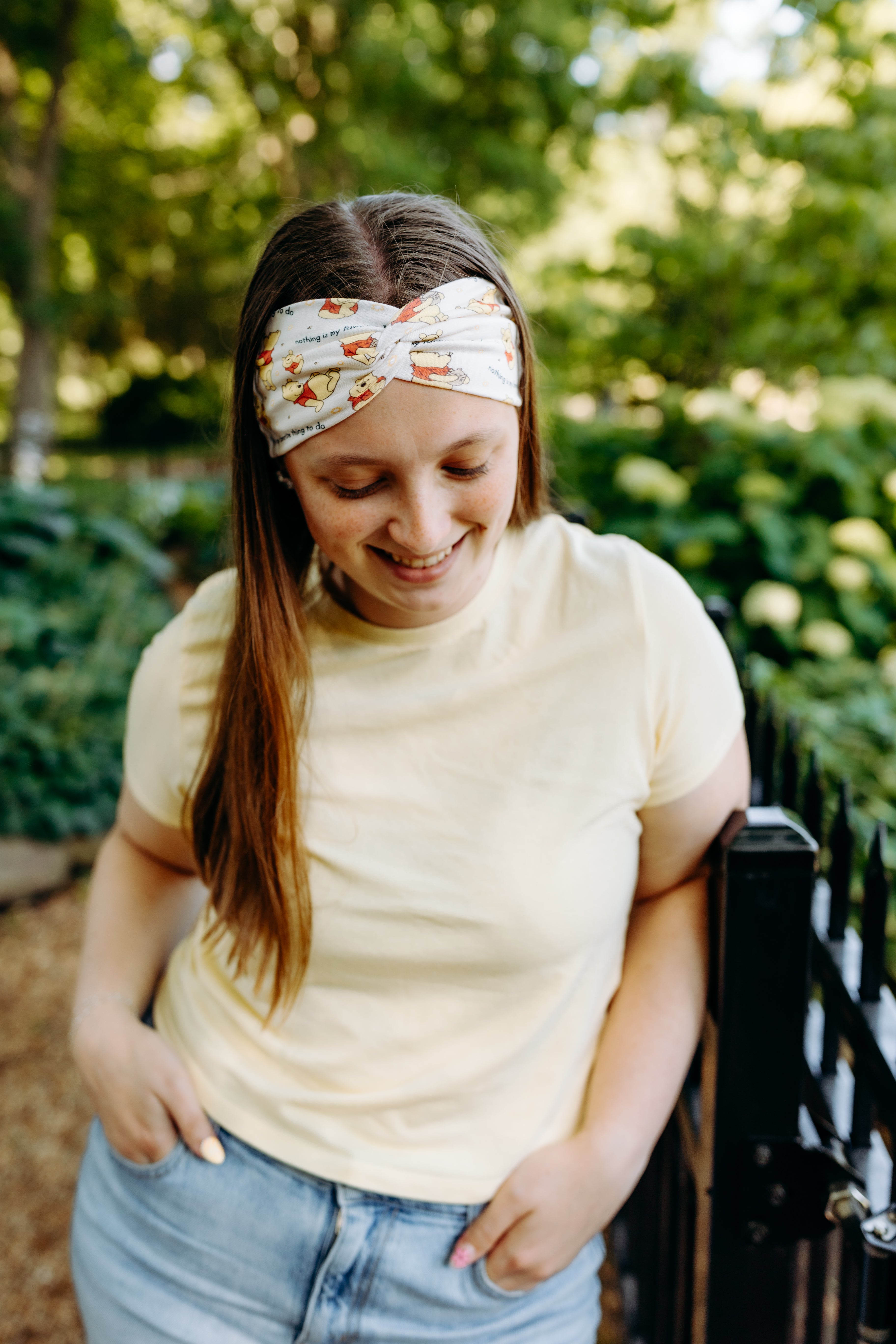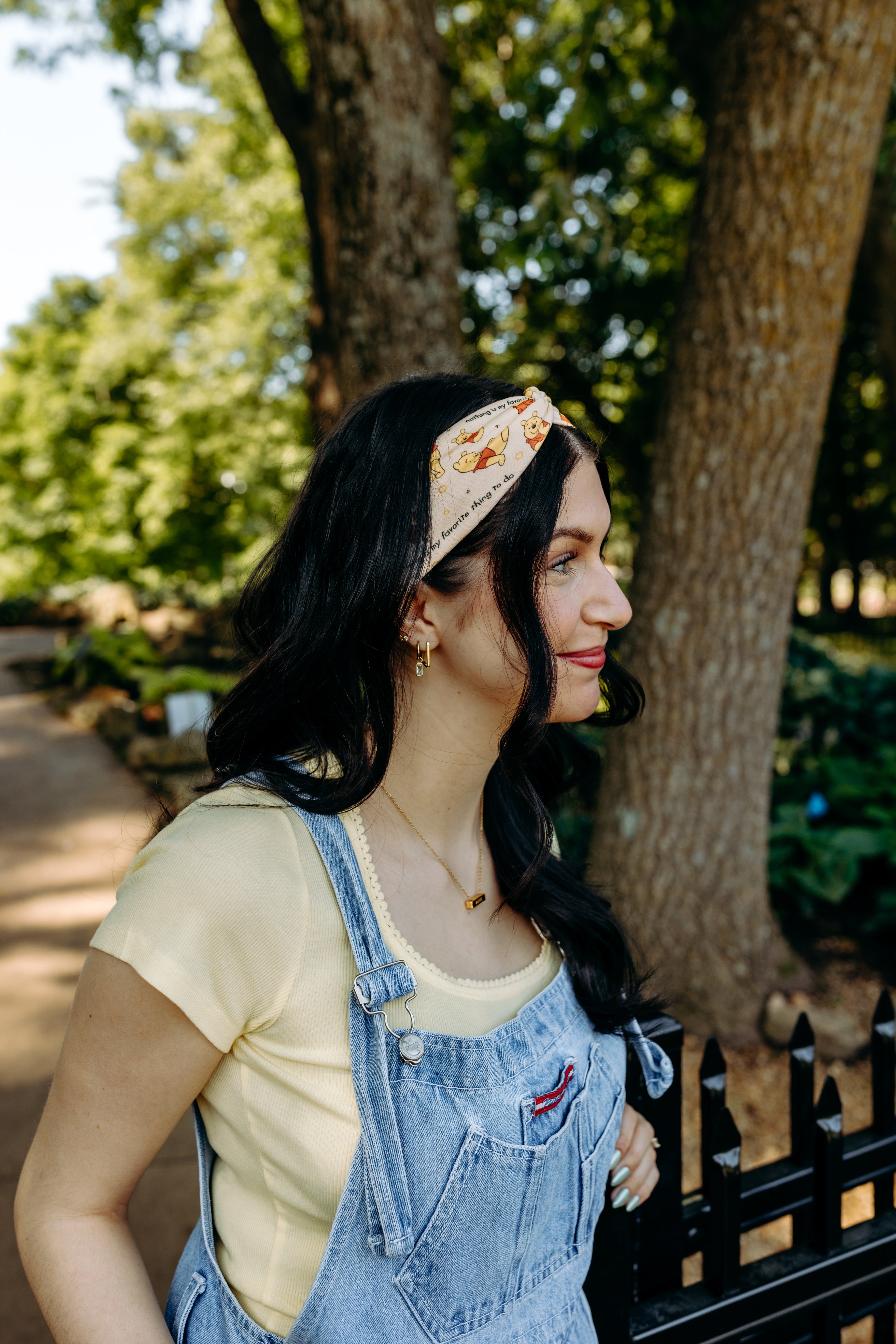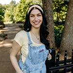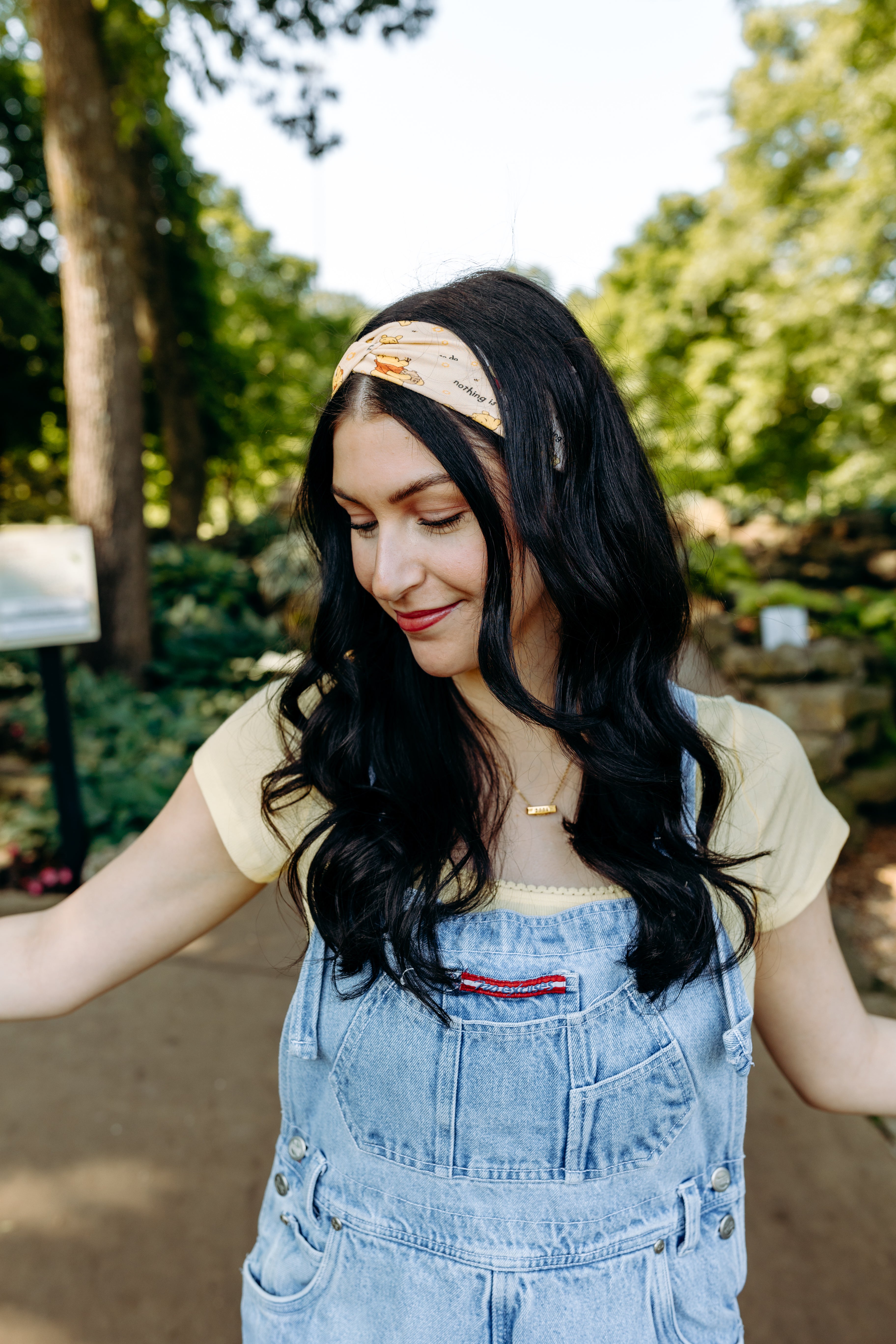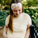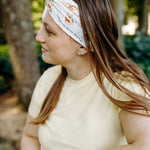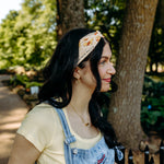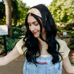 Our headbands can be worn multiple ways! You can place the knot in the middle, to the side, or around to the back so the widest part of the headband is visible. You can wear the headband in front of your hairline, or with some hair pieces framing your face. The style possibilities are endless.