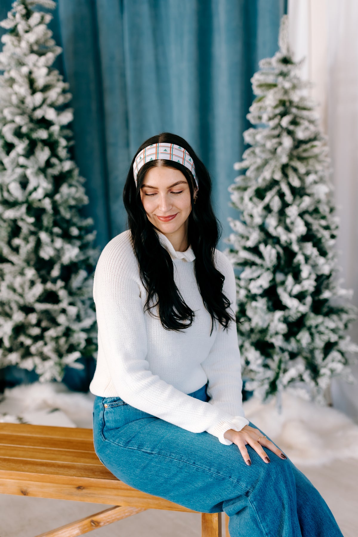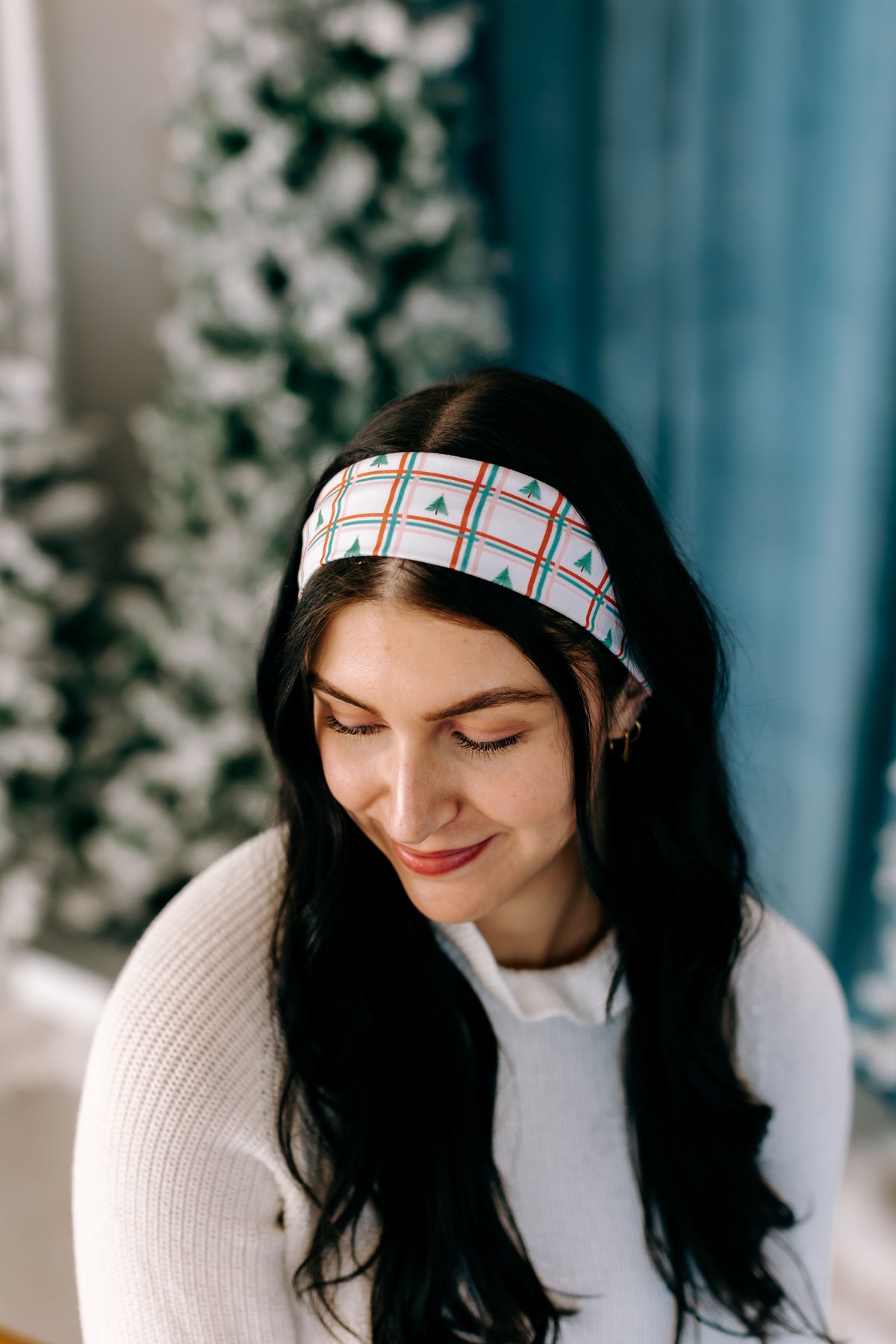 Been an Angel All Year white headband with red, green and pink plaid pattern and tiny trees, featuring a versatile 3-in-1 twist style, buttery-soft poly-knit blend, and non-slip, sweat-absorbent double-layer fabric.