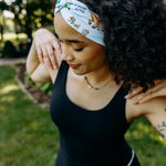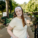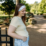 Our headbands can be worn multiple ways! You can place the knot in the middle, to the side, or around to the back so the widest part of the headband is visible. You can wear the headband in front of your hairline, or with some hair pieces framing your face. The style possibilities are endless.