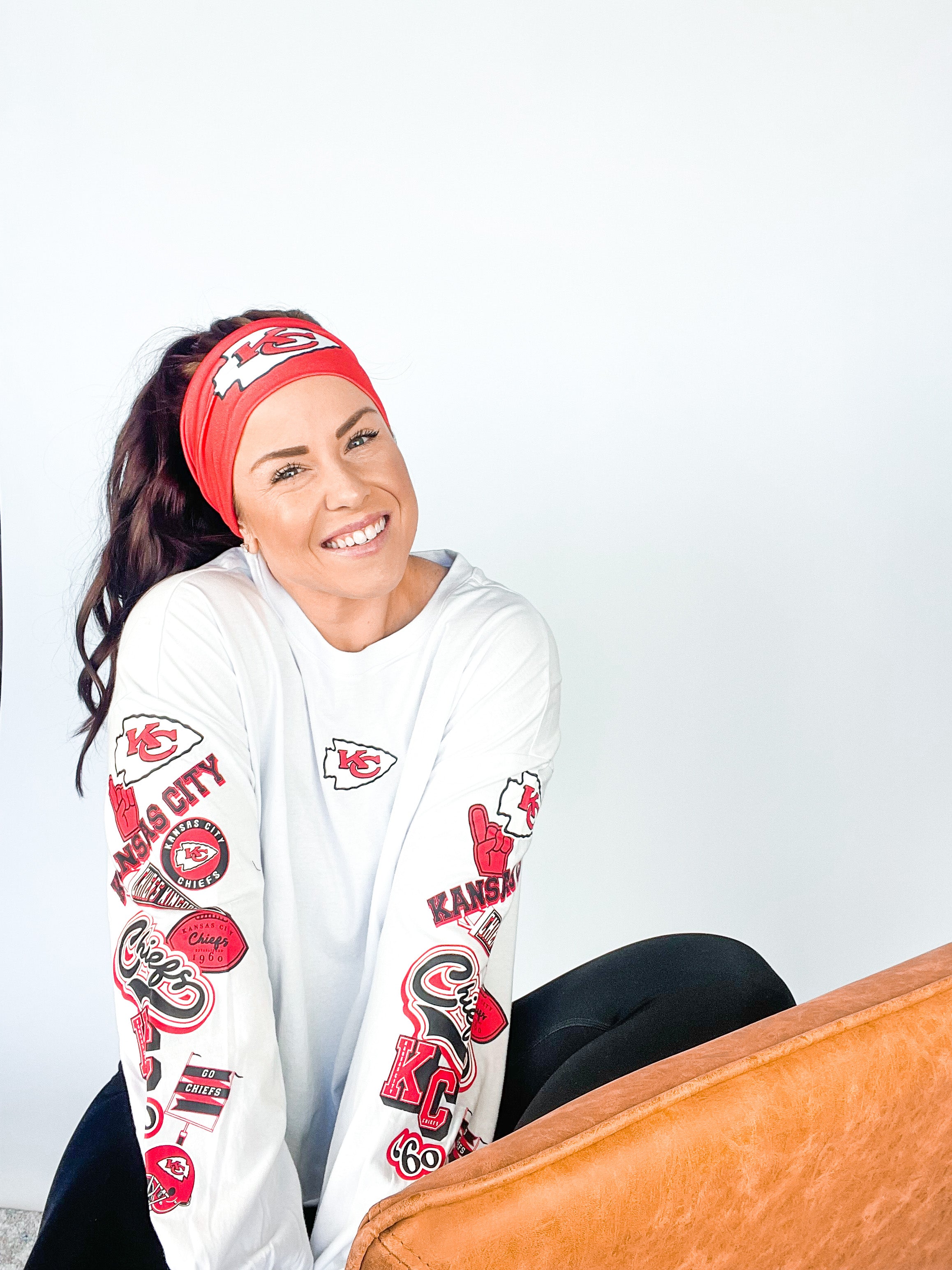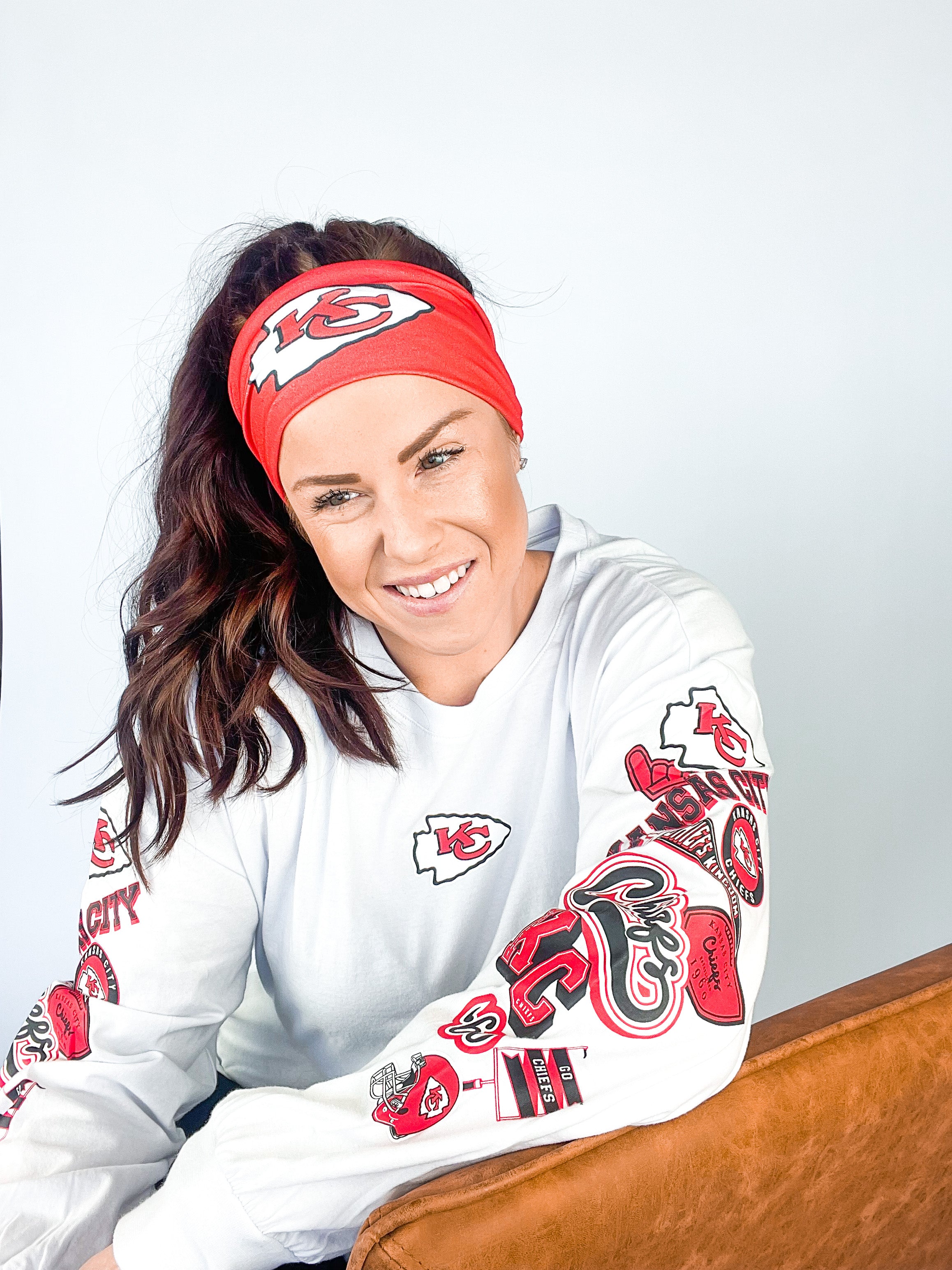 Adult women's red headband with one white arrowhead and red "KC" font in the center