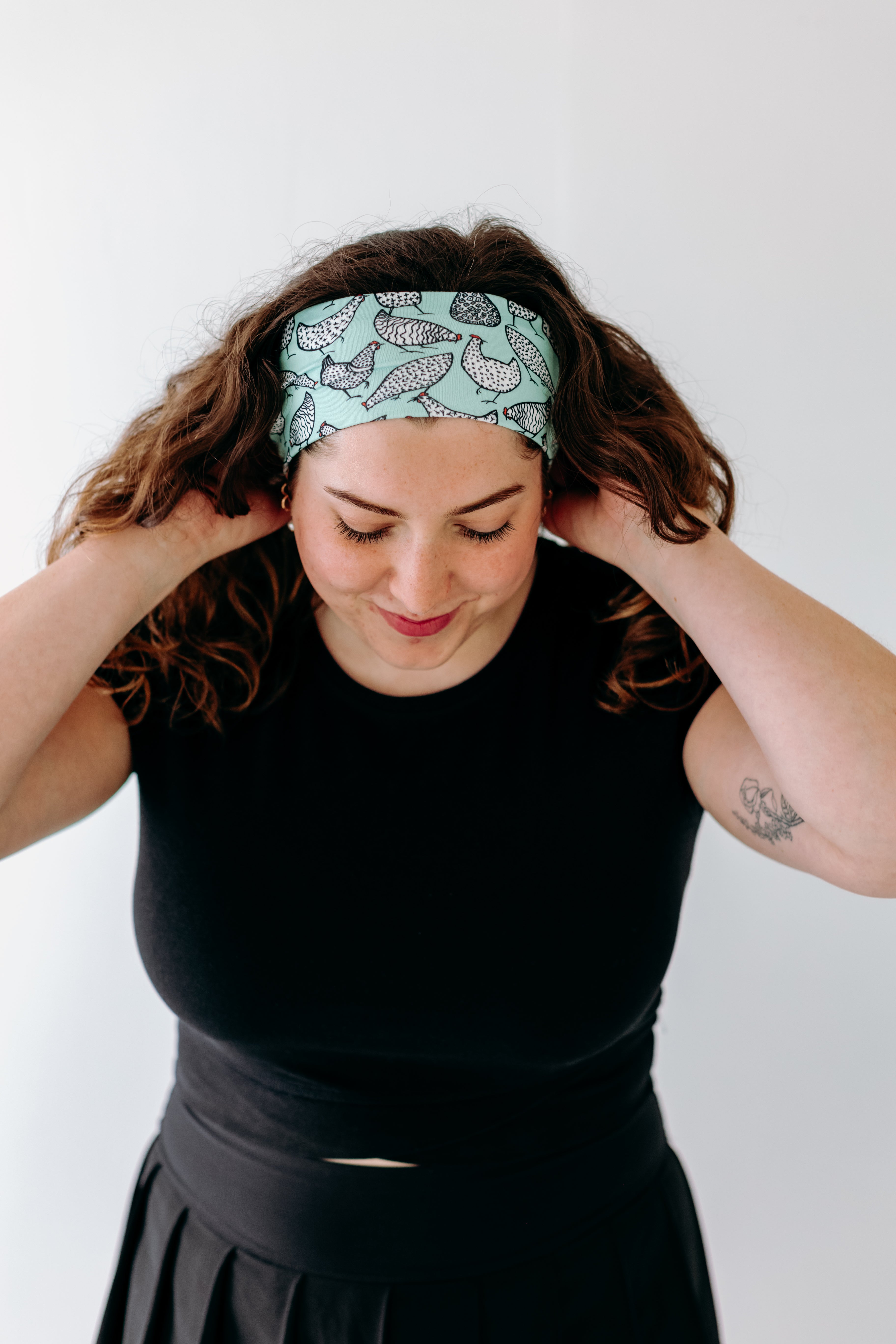 Adult women's light teal headband with allover black and white cartoon chicken print