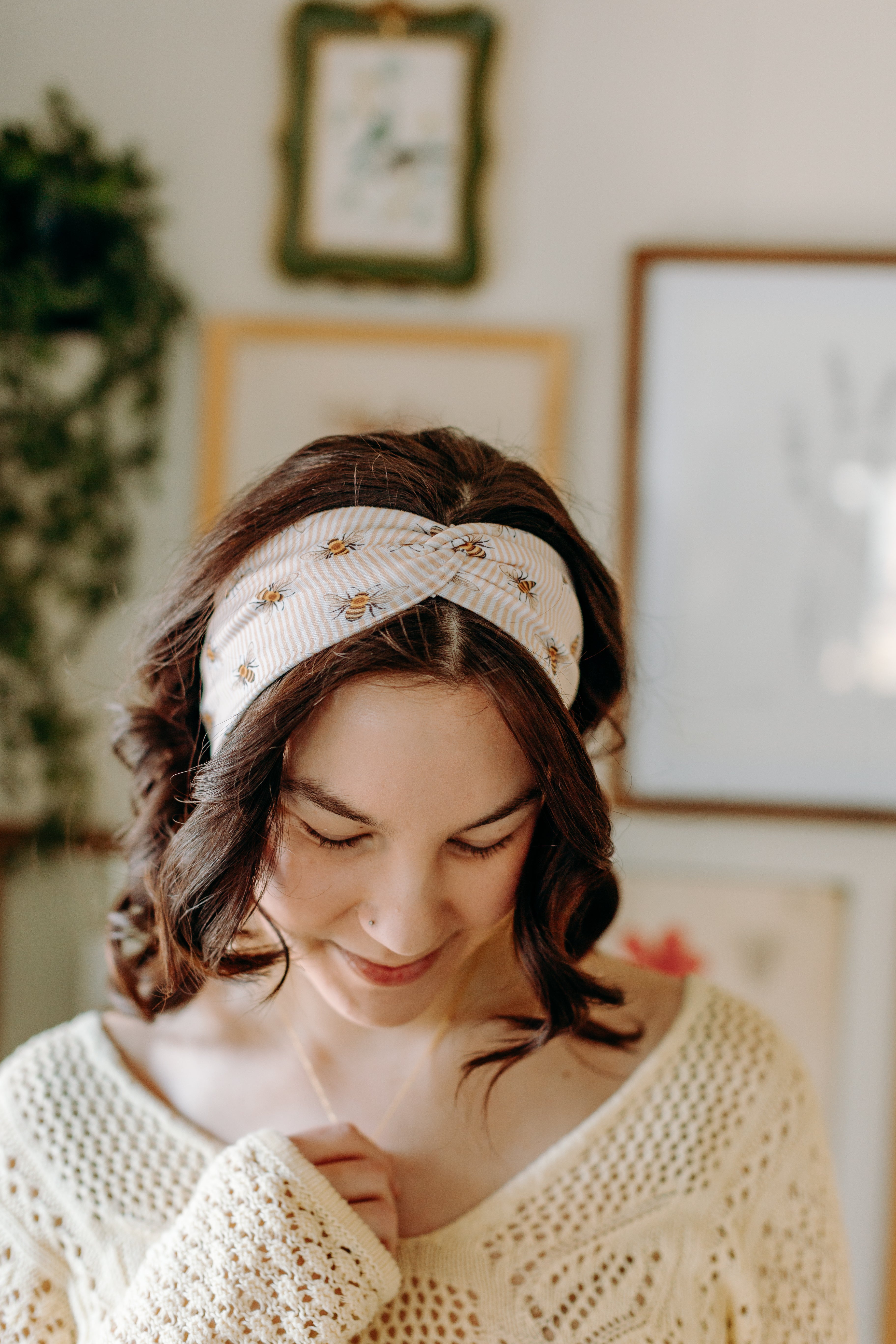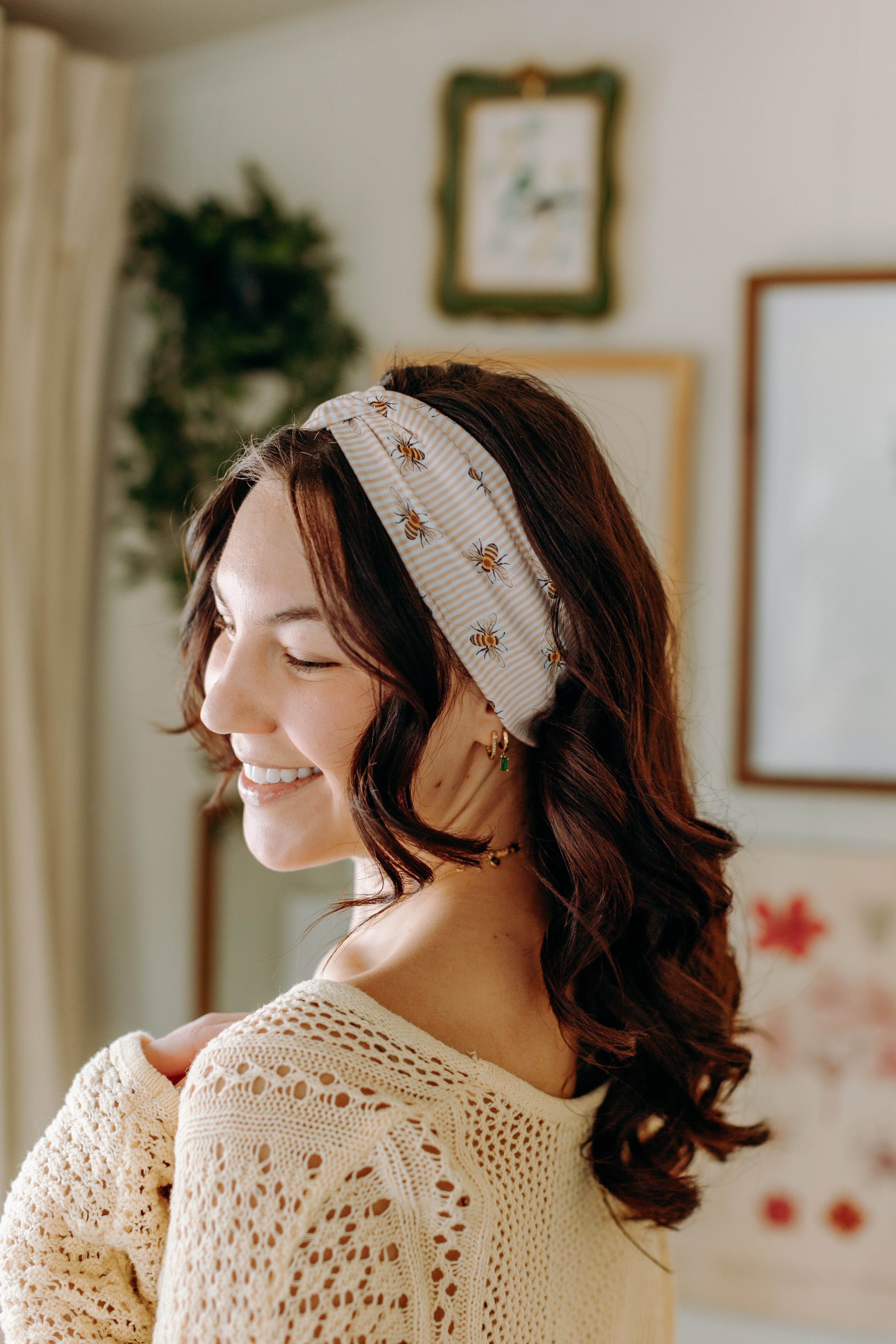 Our headbands can be worn multiple ways! You can place the knot in the middle, to the side, or around to the back so the widest part of the headband is visible. You can wear the headband in front of your hairline, or with some hair pieces framing your face. The style possibilities are endless.