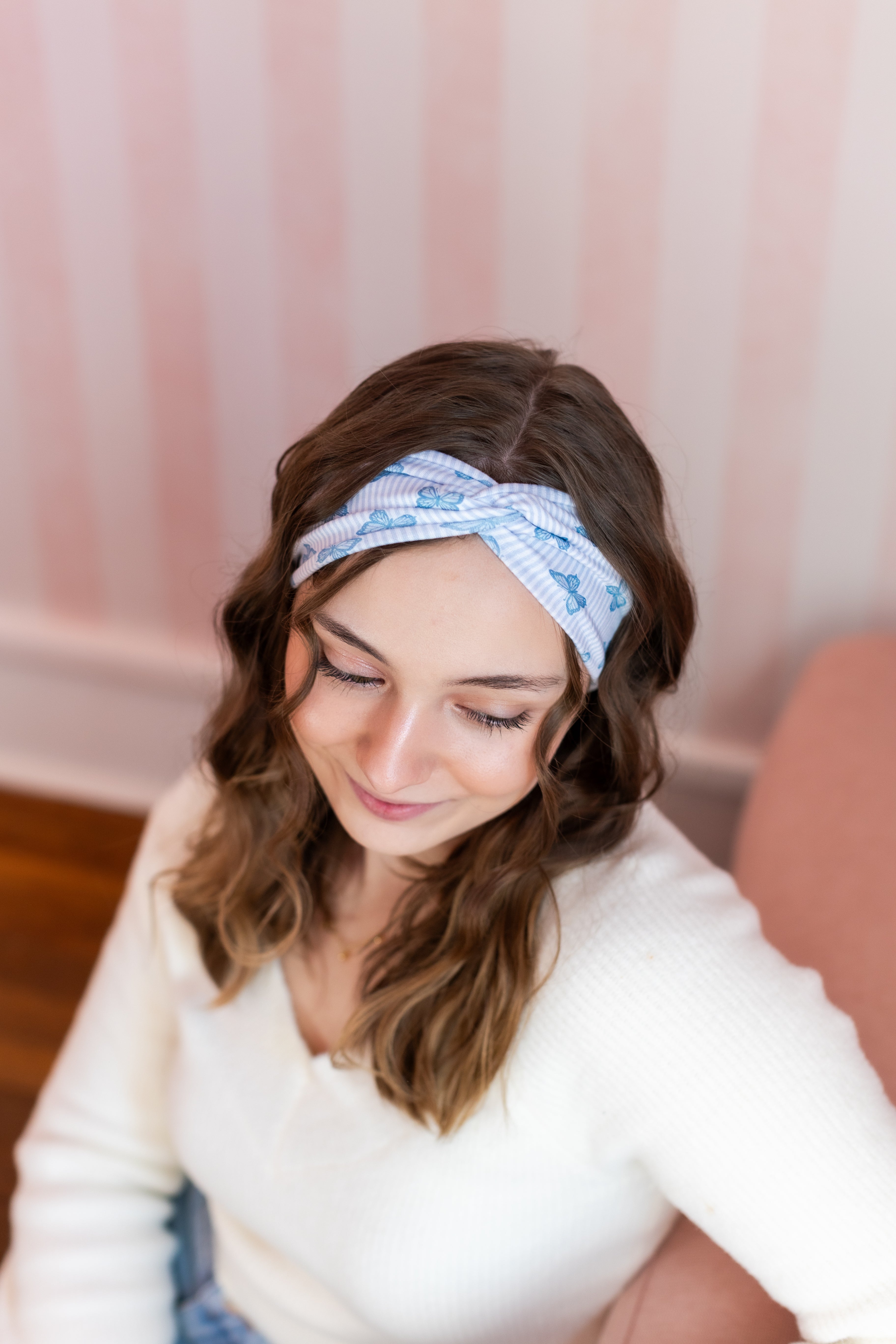 Our headbands can be worn multiple ways! You can place the knot in the middle, to the side, or around to the back so the widest part of the headband is visible. You can wear the headband in front of your hairline, or with some hair pieces framing your face. The style possibilities are endless.