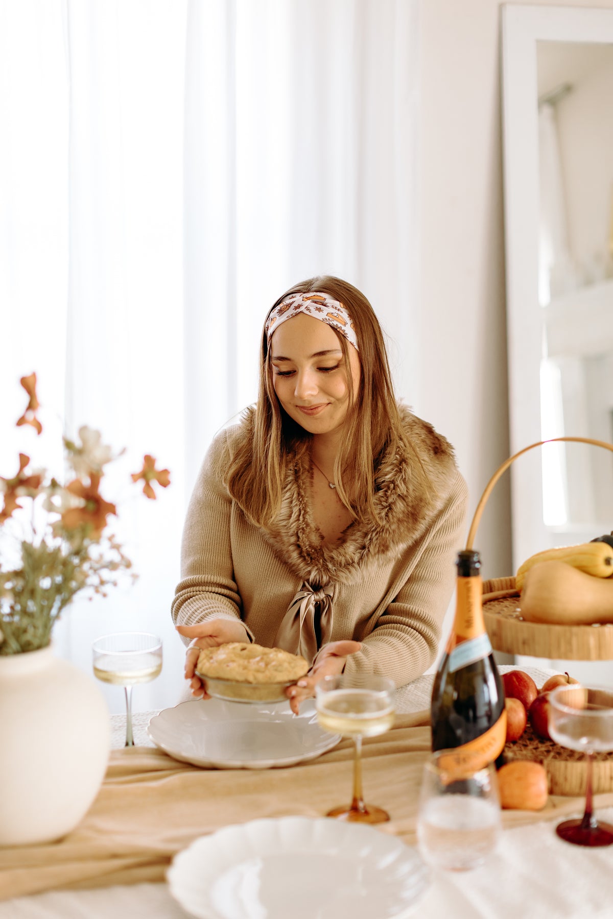 Woman smiling confidently in front of a tree, wearing the Sweet as Pie headband by Lilac Market Headbands, showcasing its versatile, non-slip design.